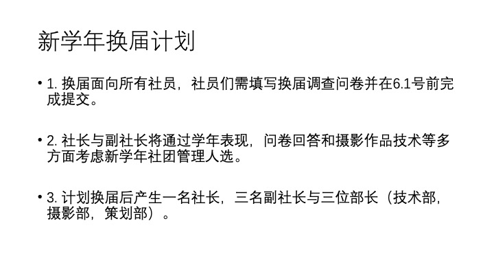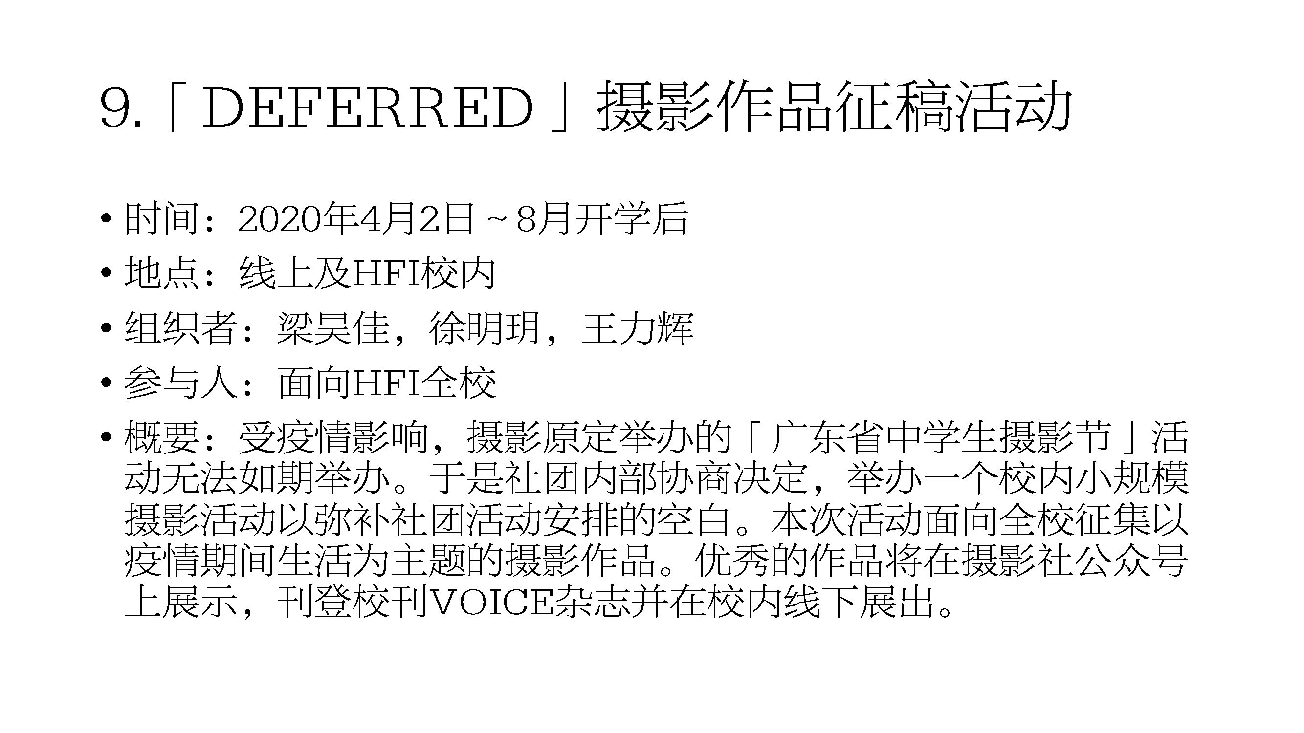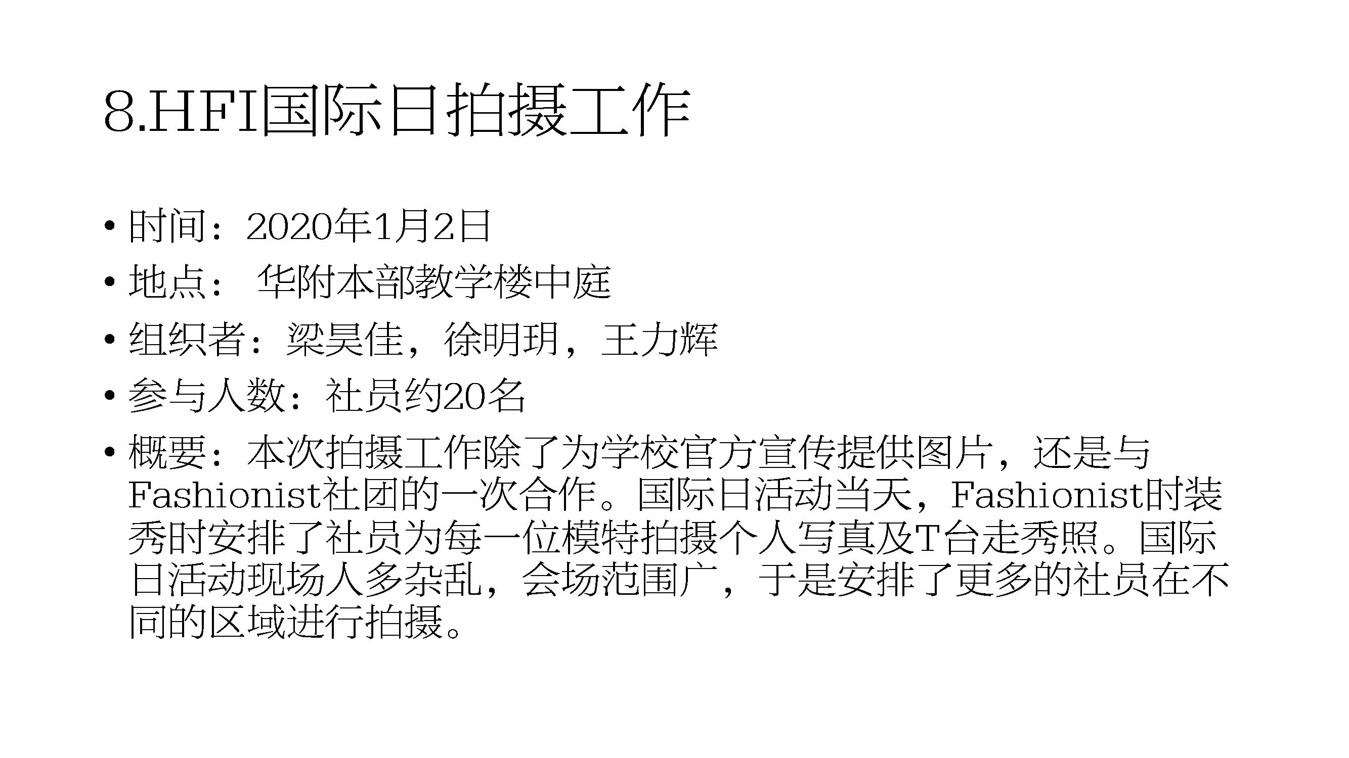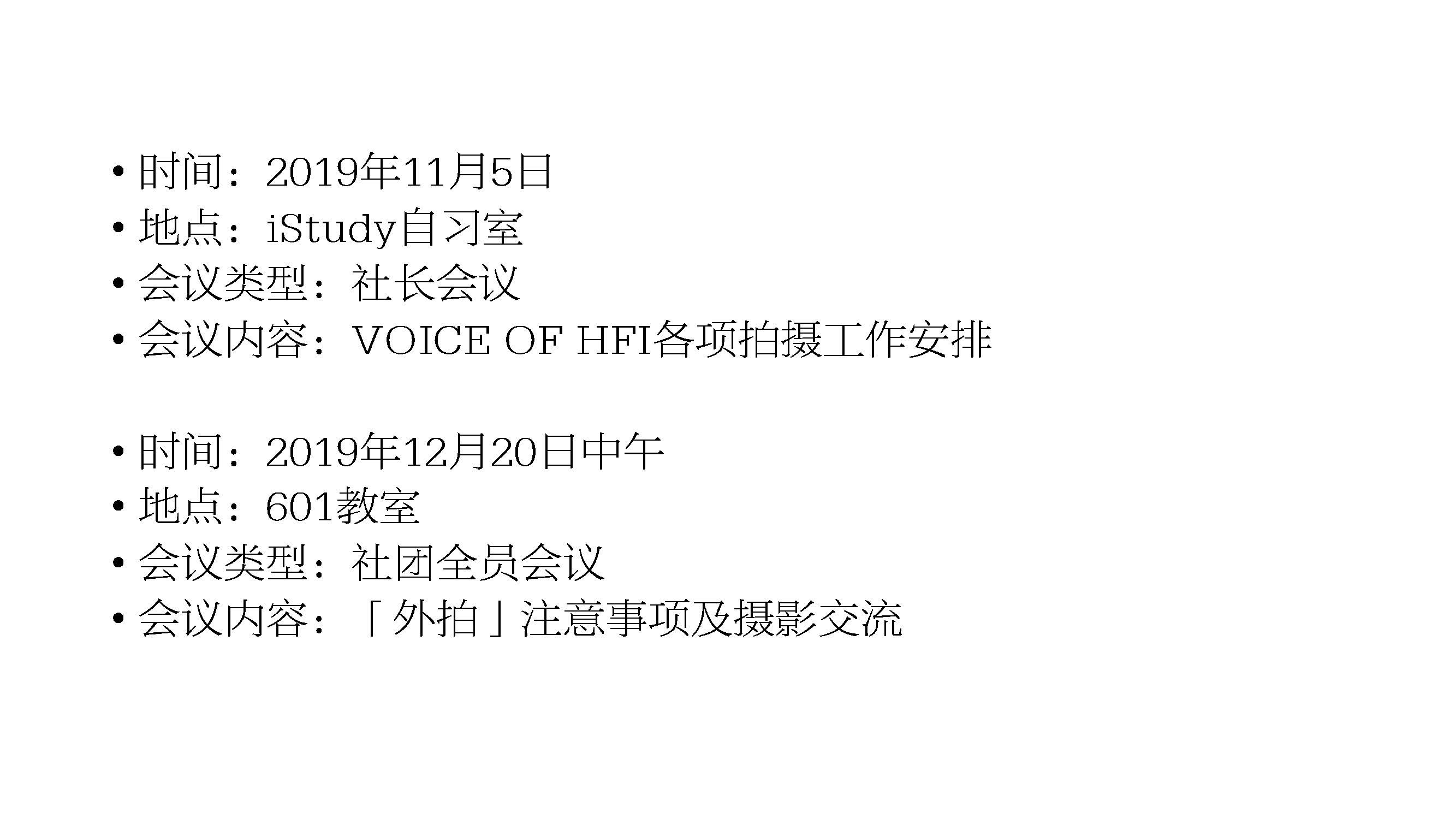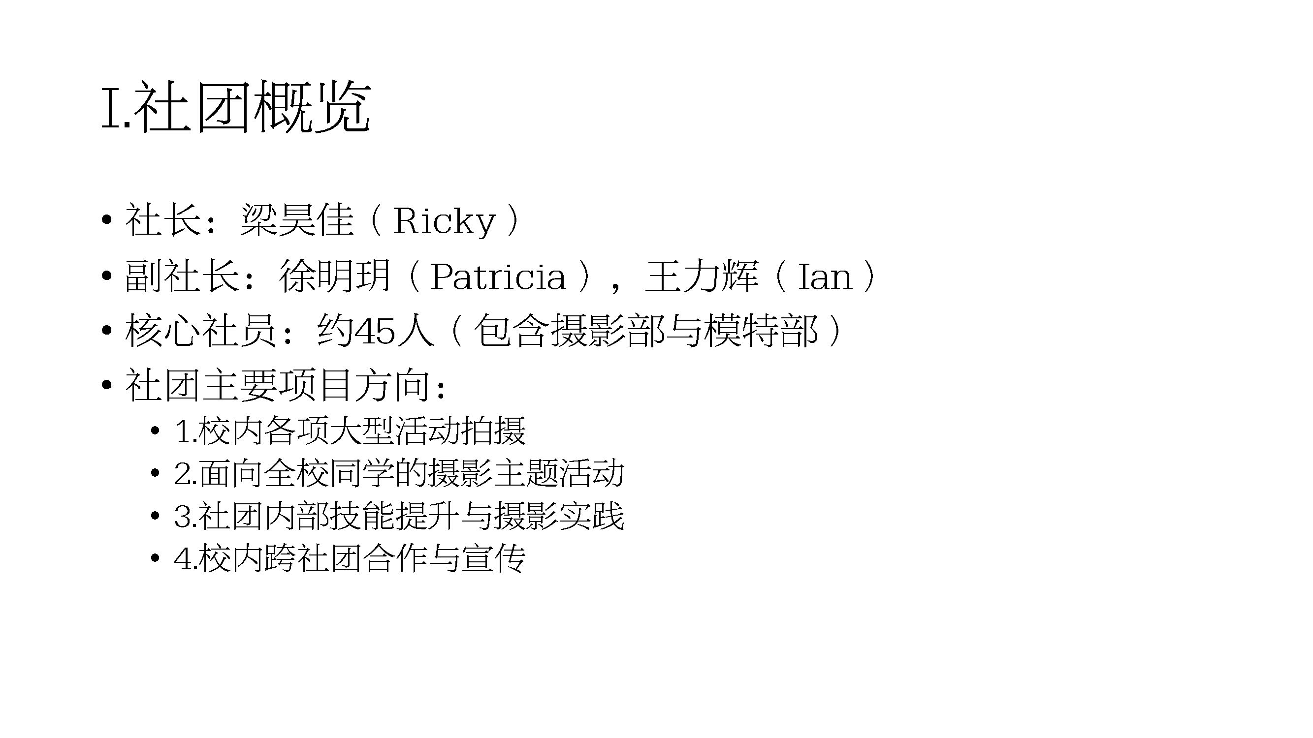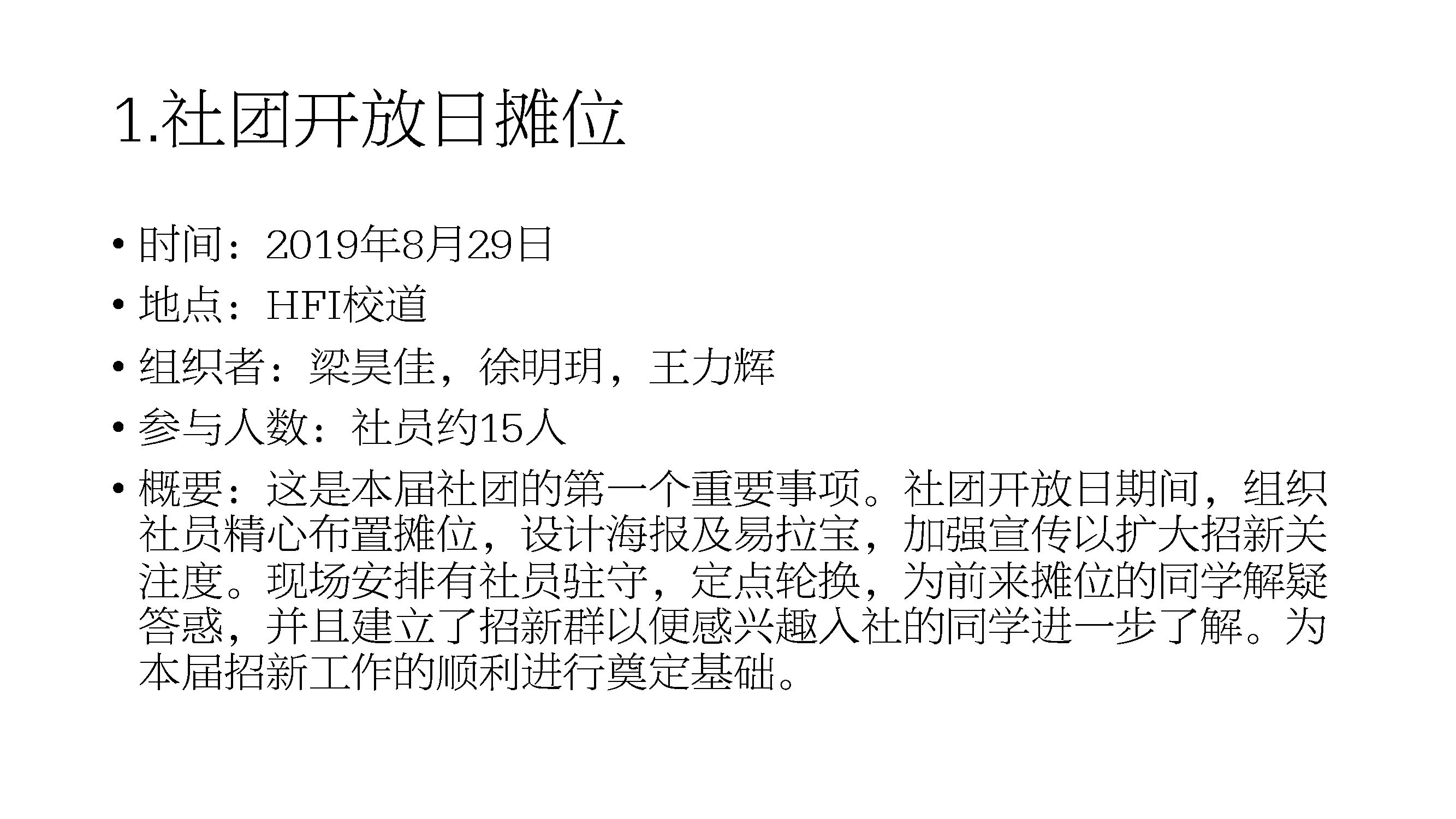 为了让新社员更熟悉HFIPhotos,第一次社团例会主要内容包括自我介绍,此学年活动大概timeline,以及社团规则。