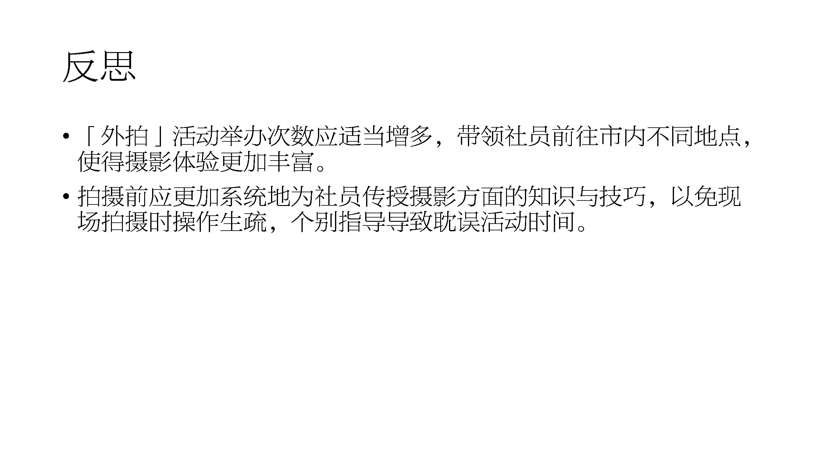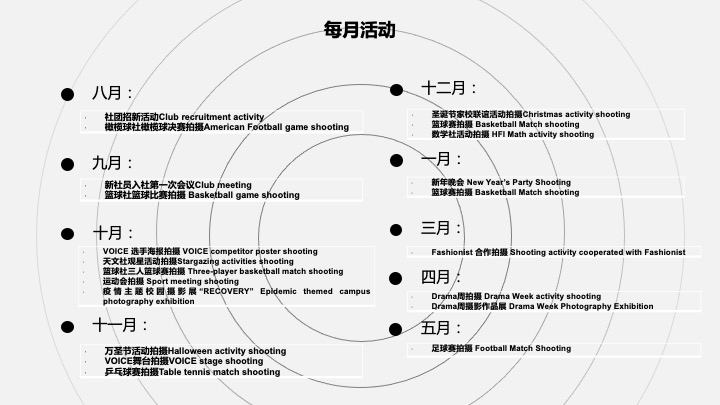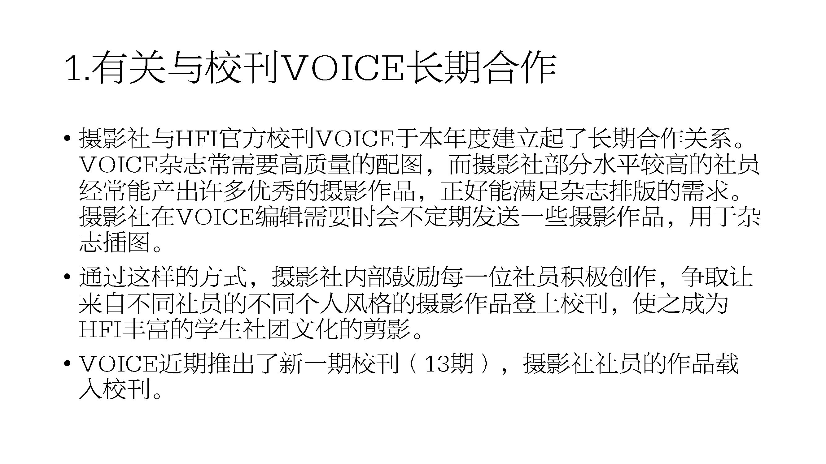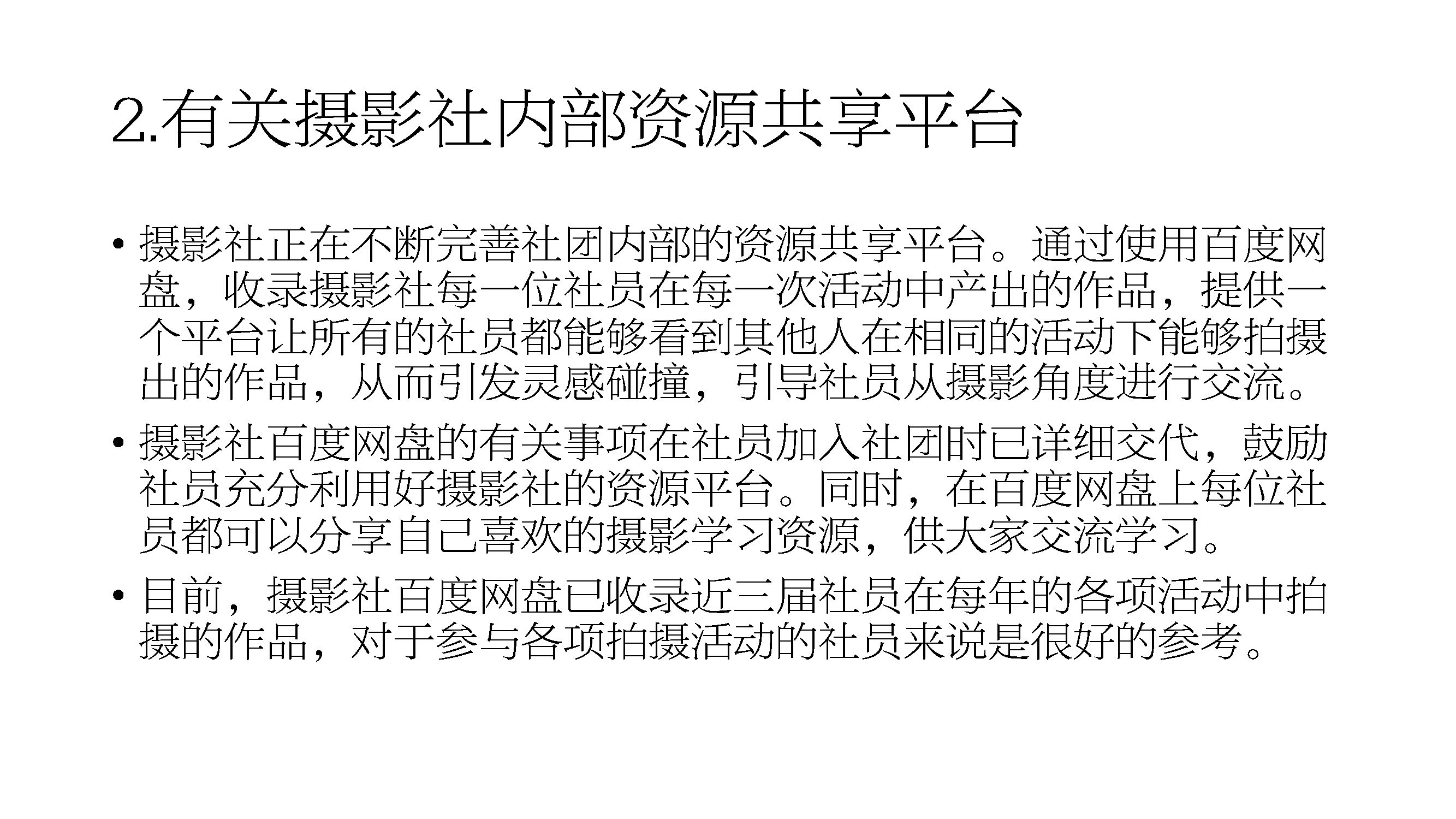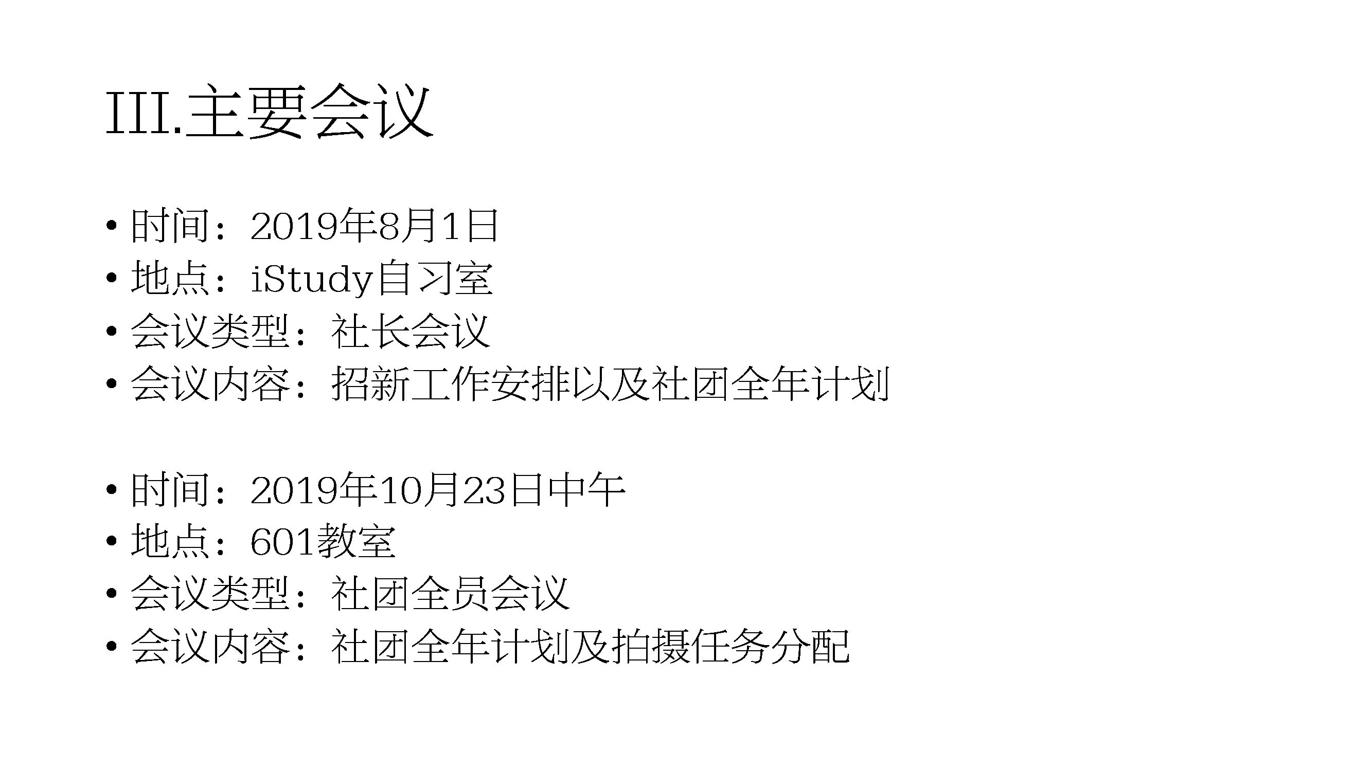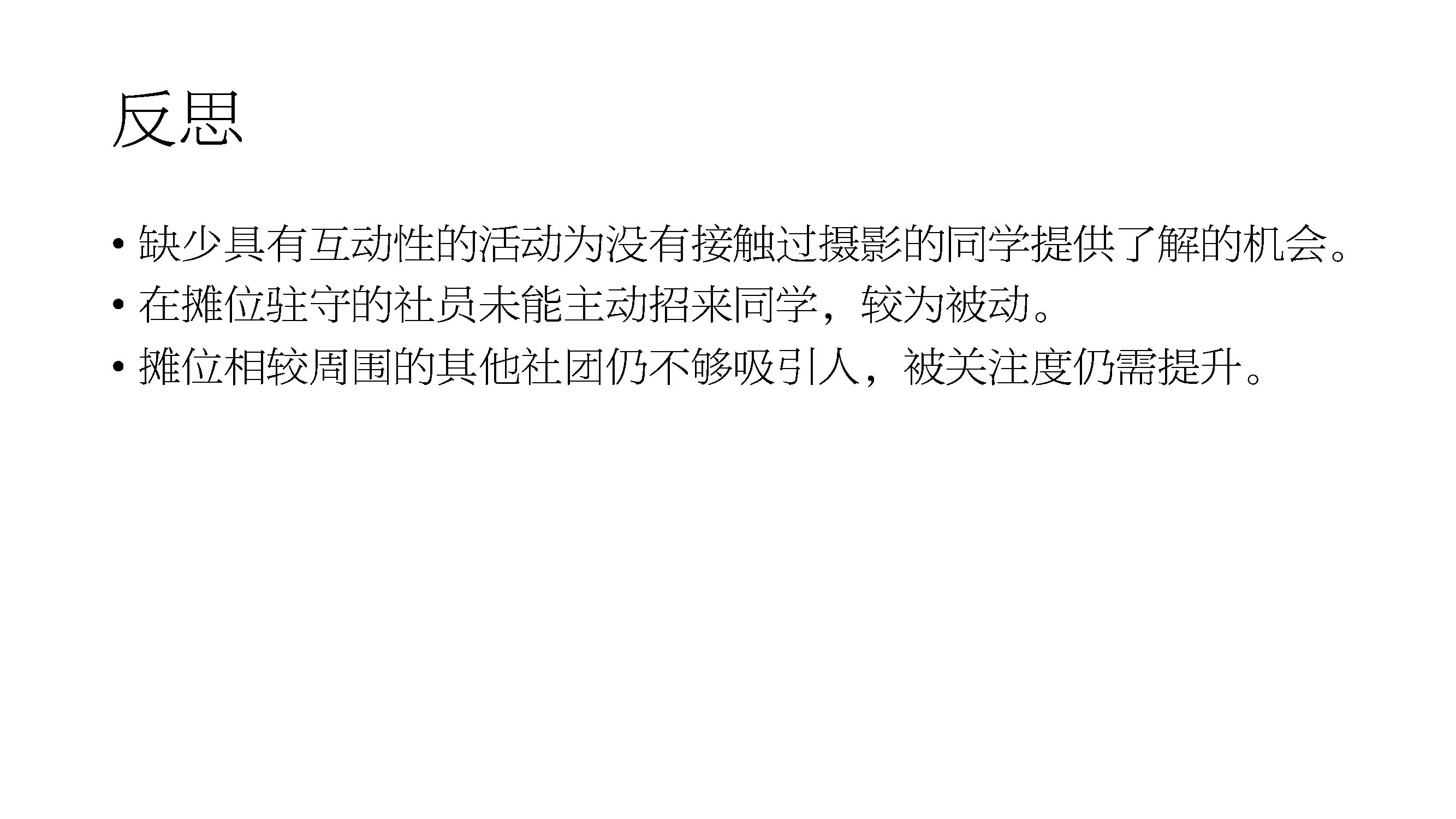 为了让新社员更熟悉HFIPhotos,第一次社团例会主要内容包括自我介绍,此学年活动大概timeline,以及社团规则。