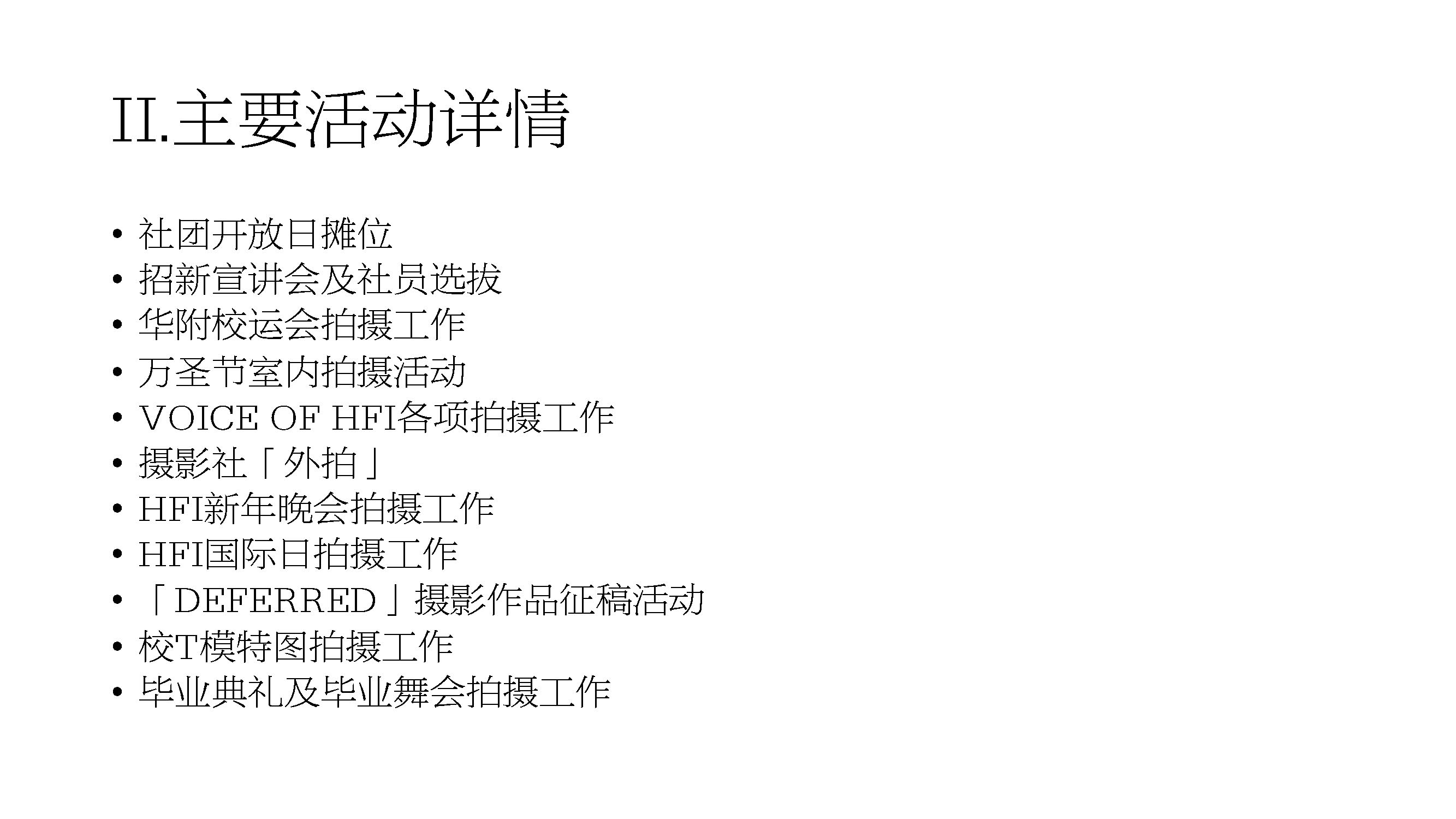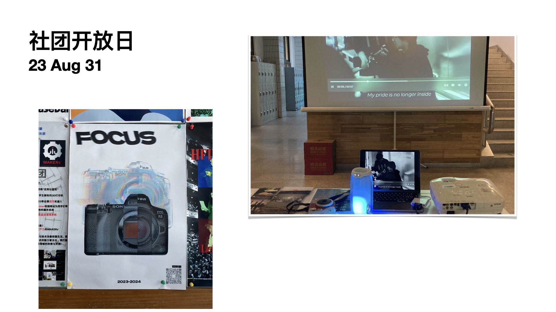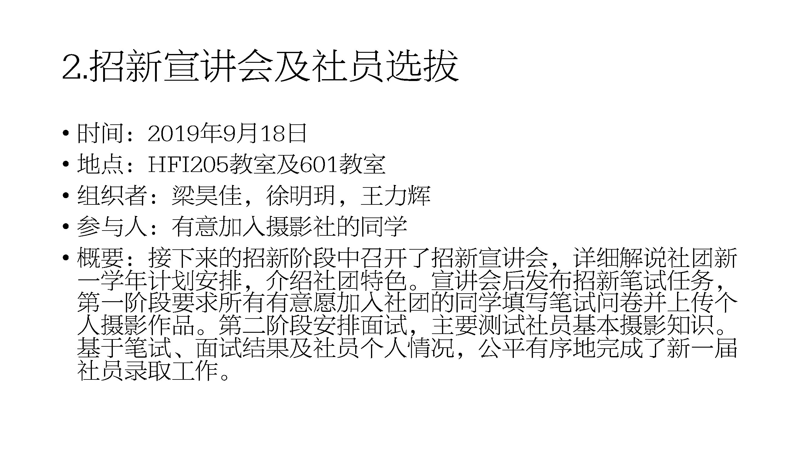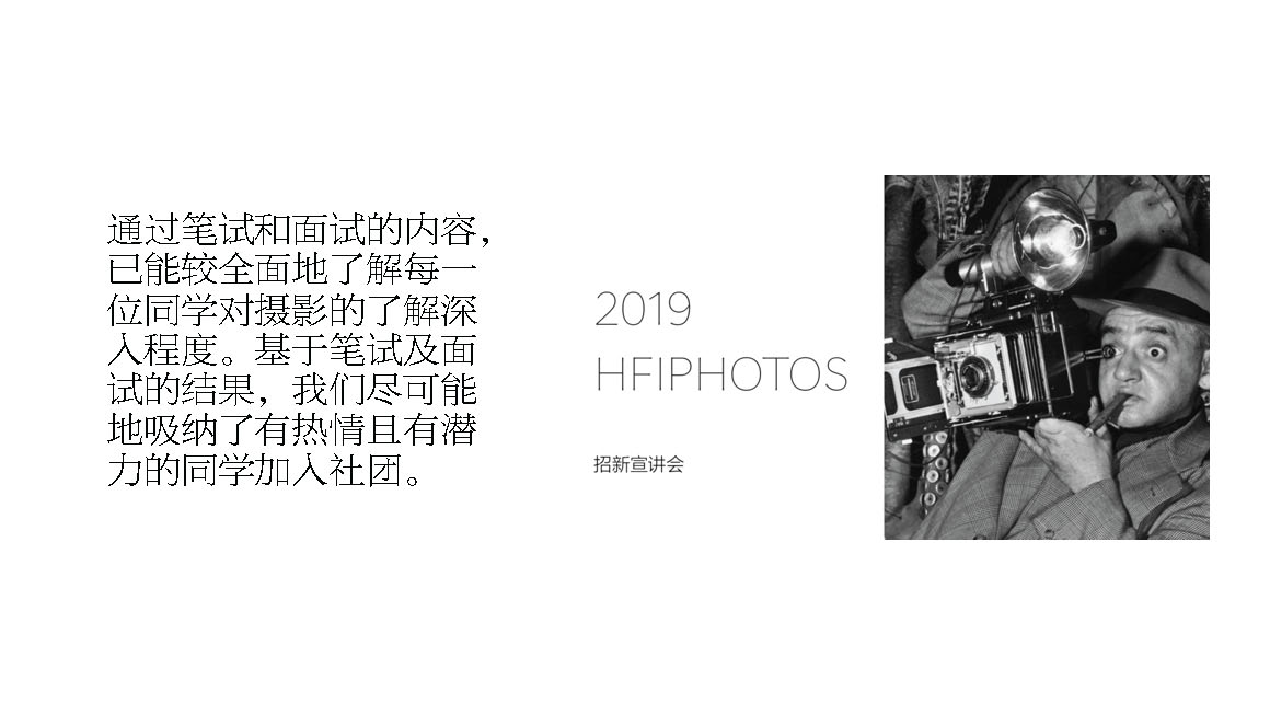 为了让同学们更具体更细节地了解HFIPhotos,HFIPhotos于 9.3举行了招新说明会,具体内容包括社团⼯作内容(校内活动拍摄、校外外拍、社刊), 社团福利(定期Lecture、外拍吃喝玩耍、志愿者时数),以及加入方式进行了具体的说明。招新会