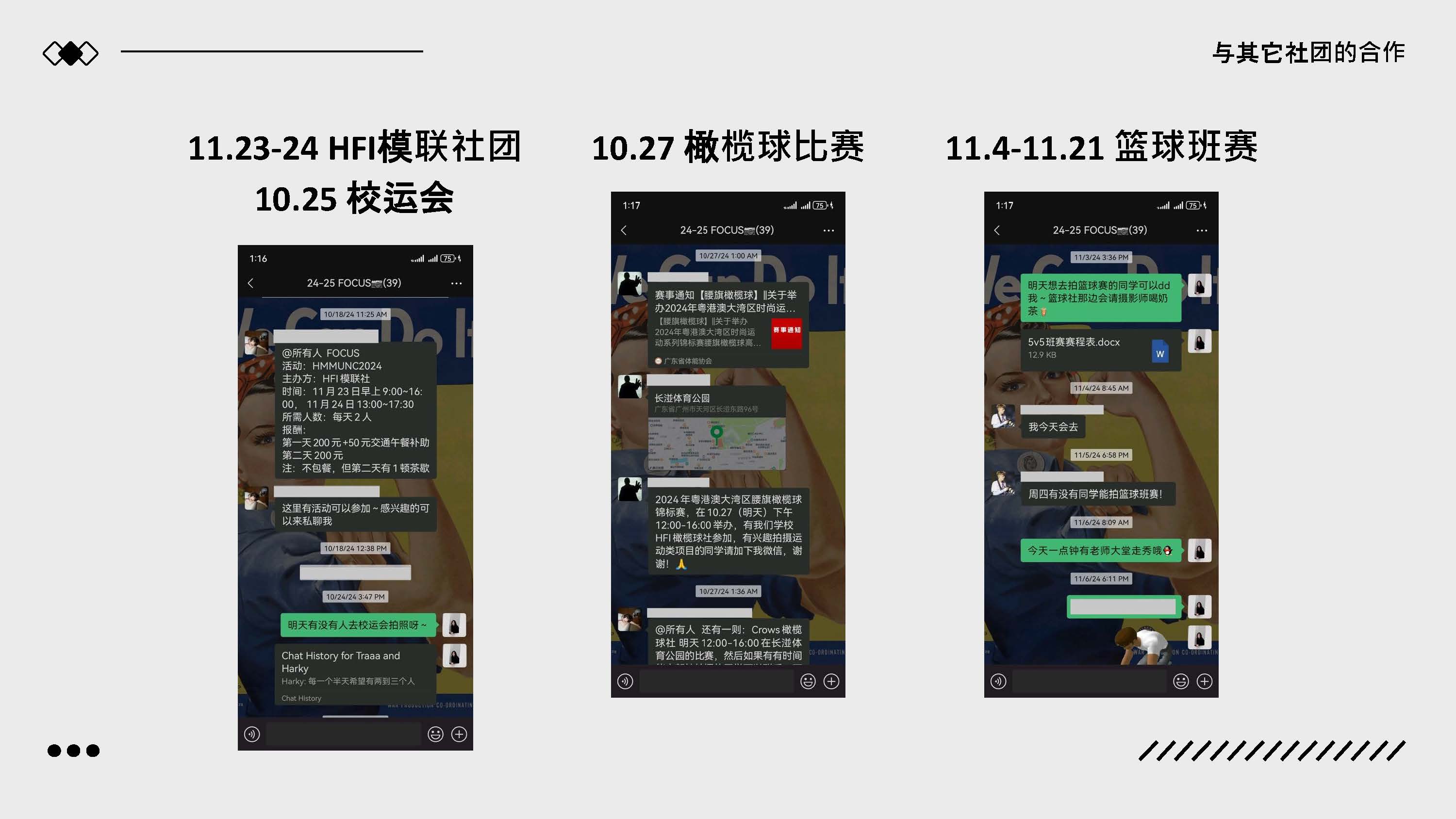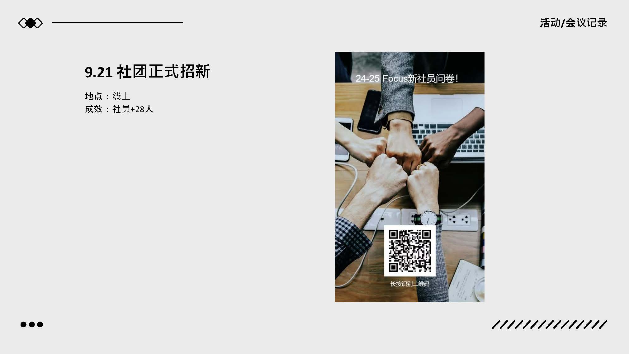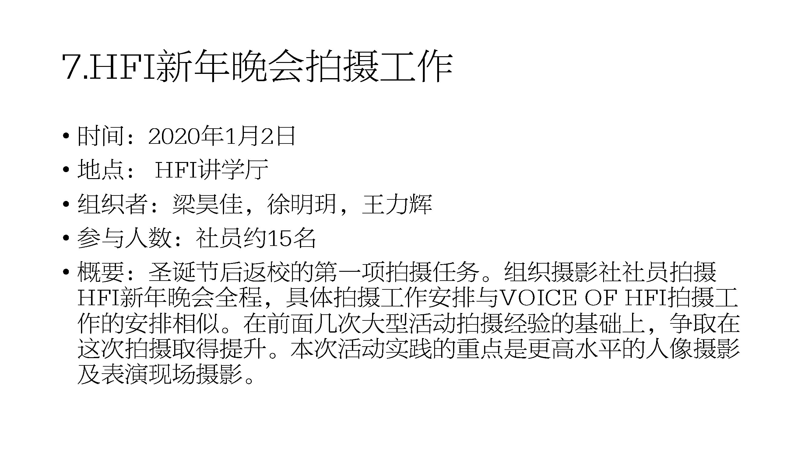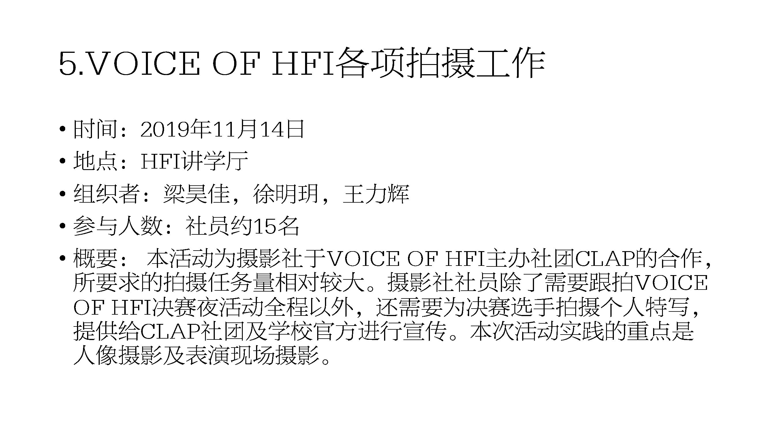 为了让同学们更具体更细节地了解HFIPhotos,HFIPhotos于 9.3举行了招新说明会,具体内容包括社团⼯作内容(校内活动拍摄、校外外拍、社刊), 社团福利(定期Lecture、外拍吃喝玩耍、志愿者时数),以及加入方式进行了具体的说明。招新会