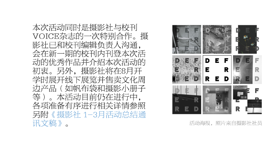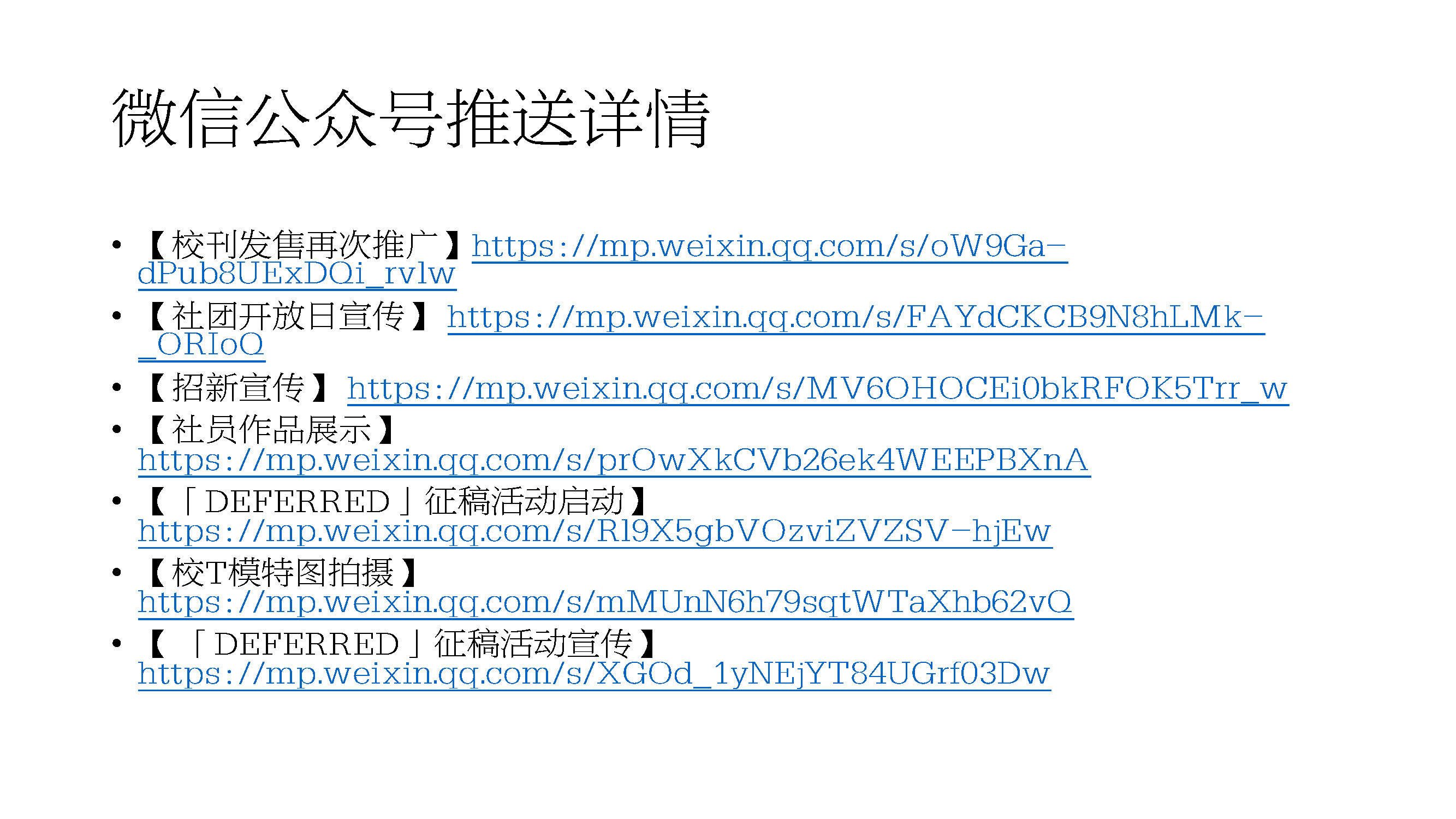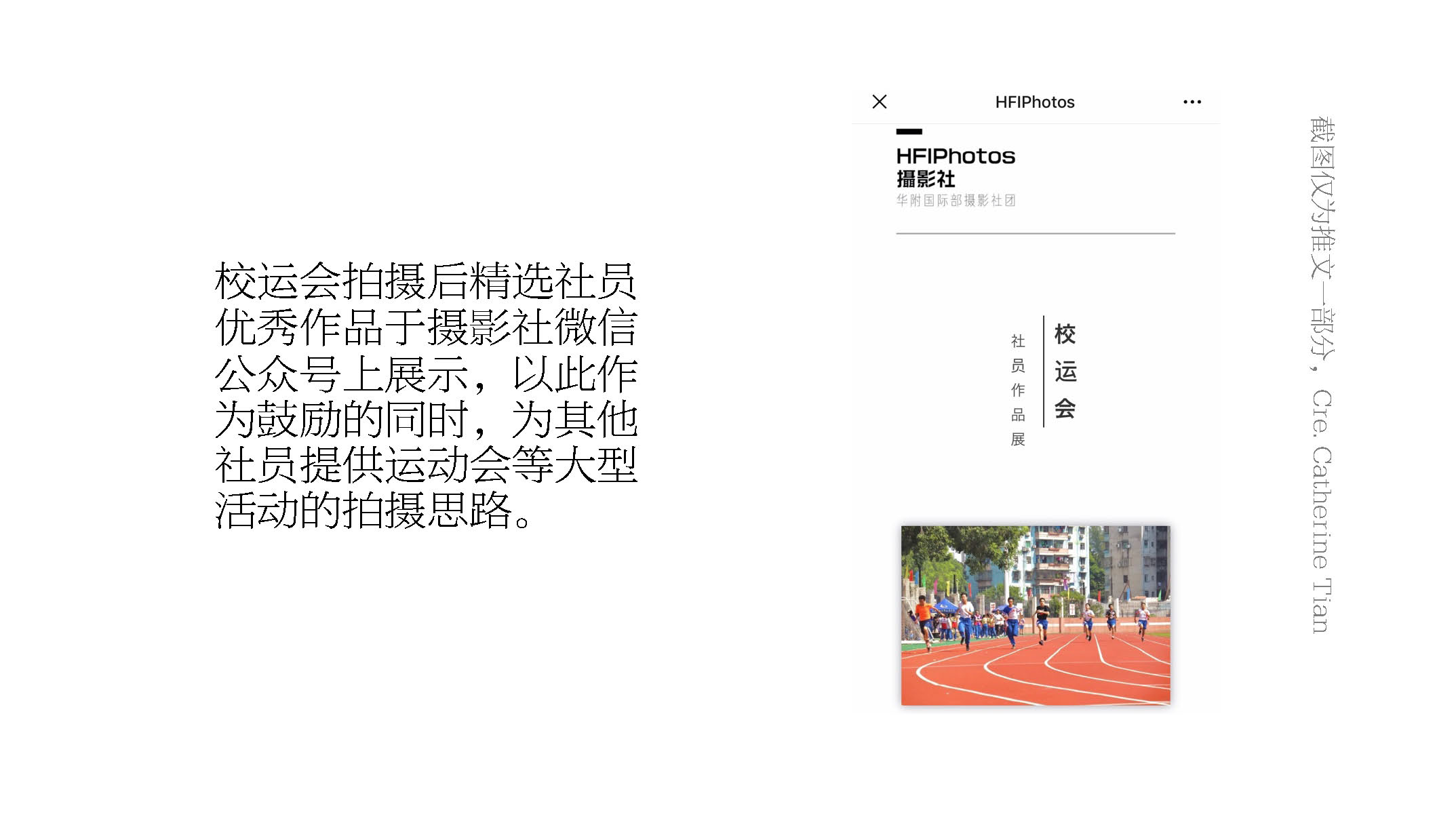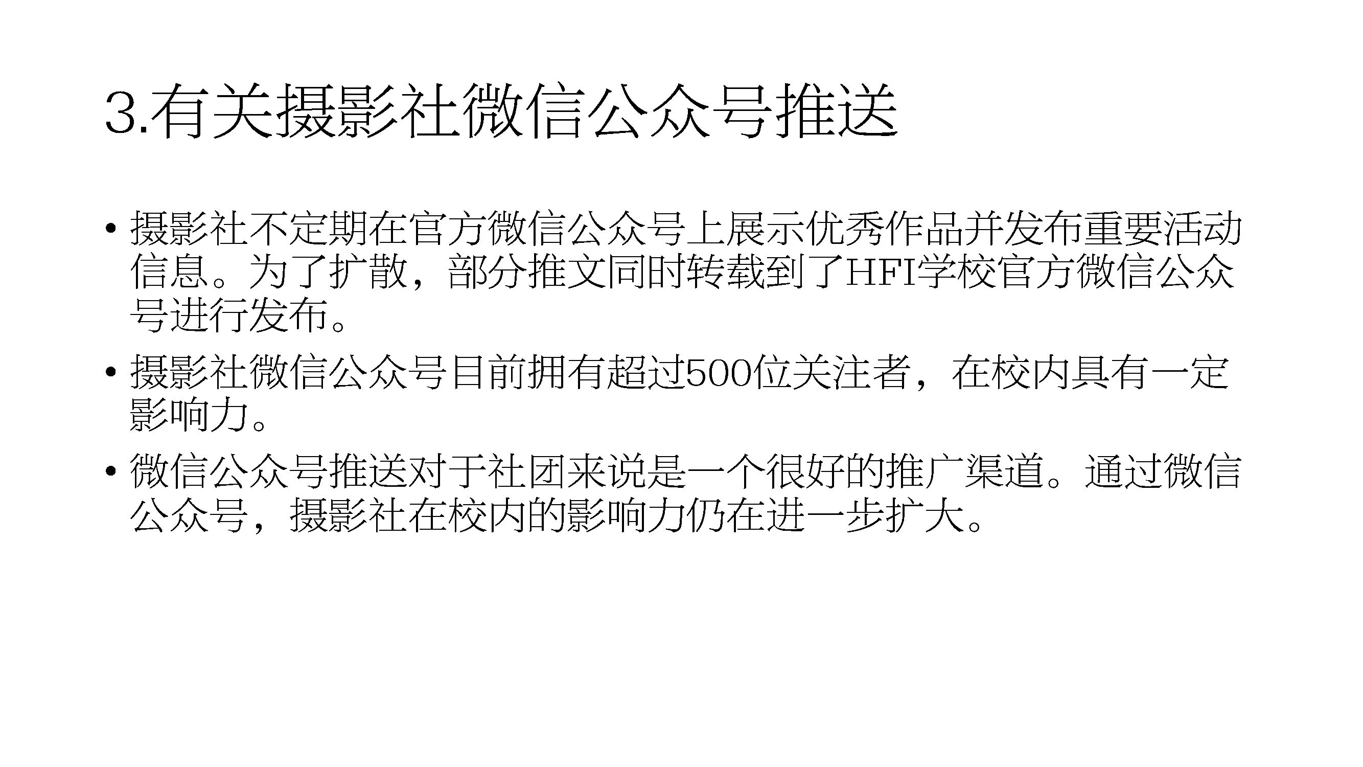 为了让因种种原因缺席社团展览招新⽇与说明会的同学知悉招新事宜,同时扩大招新讯息的传播面,社长将招新事宜在HFIPhotos 官方公众号上发布,并且广为传播。