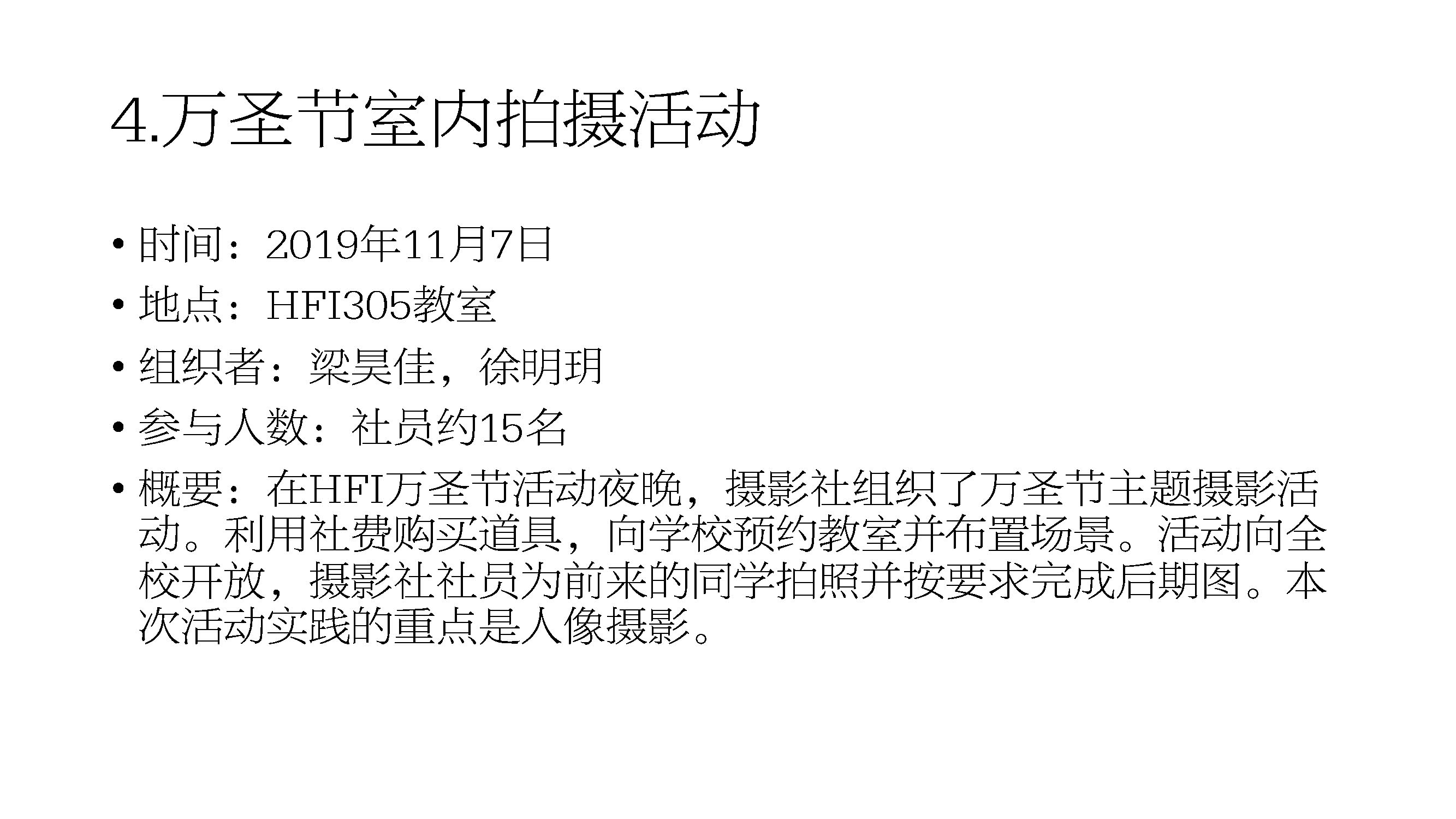 由于十月份有较多校内活动需要HFIPhotos的社员进行拍摄,为了让照片呈现较好的效果,社长决定先开展一次针对拍摄人像的Lecture。主要内容包括构图、聚焦重点、等。