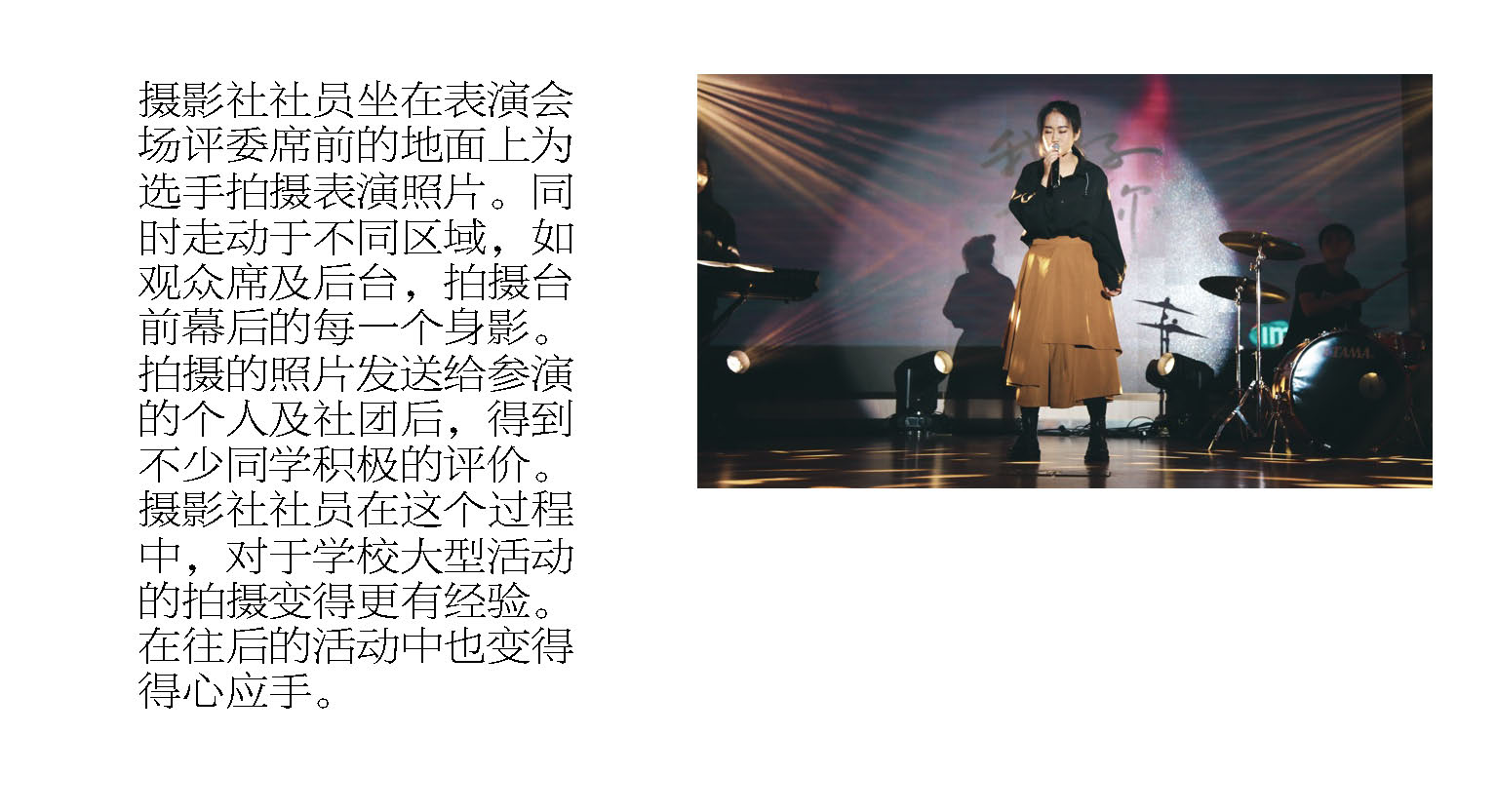 一年一度圣诞晚会少不了摄影社社员全程跟拍的身影。一大批的社员在评委席前的空地席地而坐并拍出了精美的照片。照片被用于制作阿卡贝拉社公众号等。
