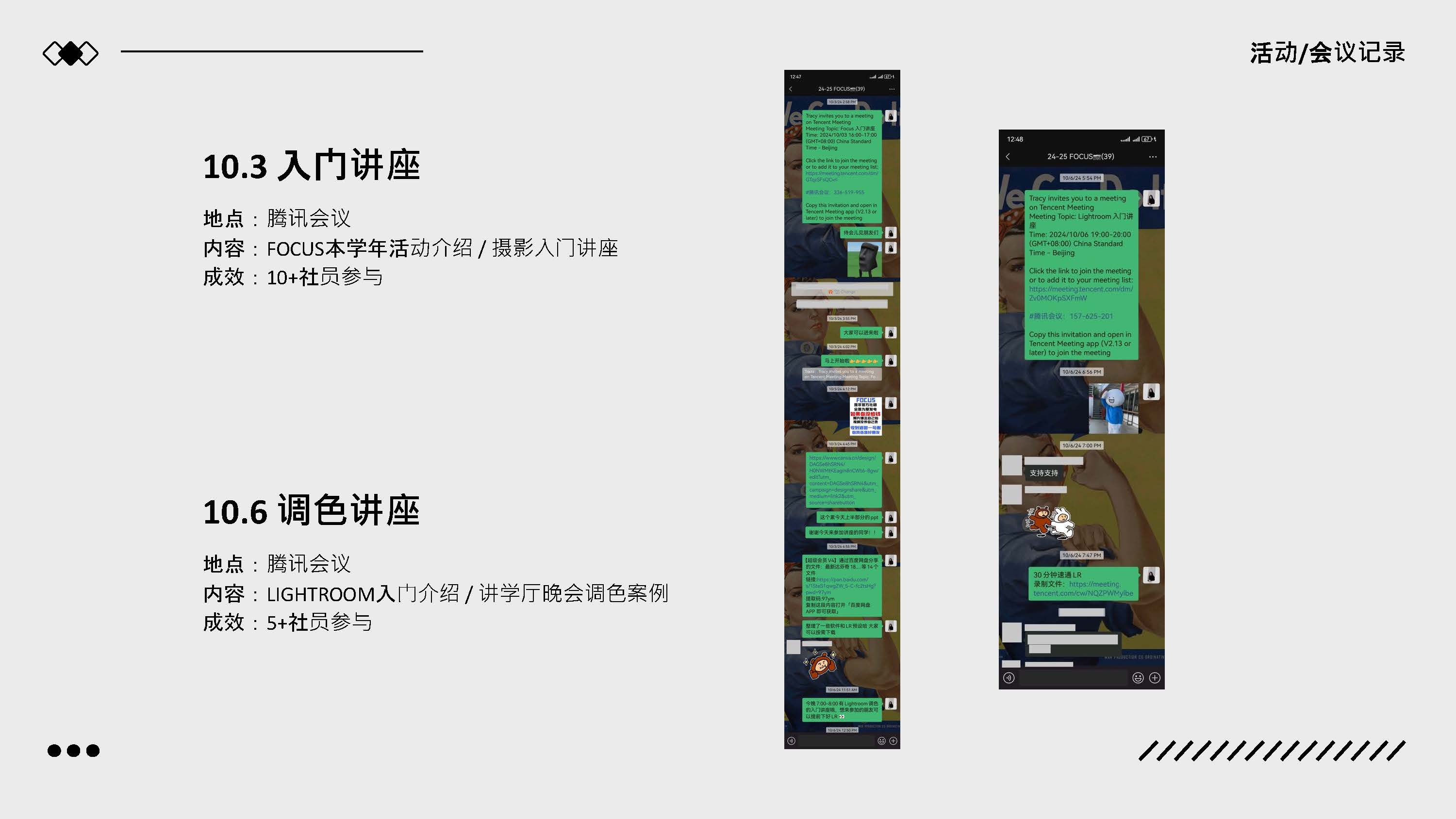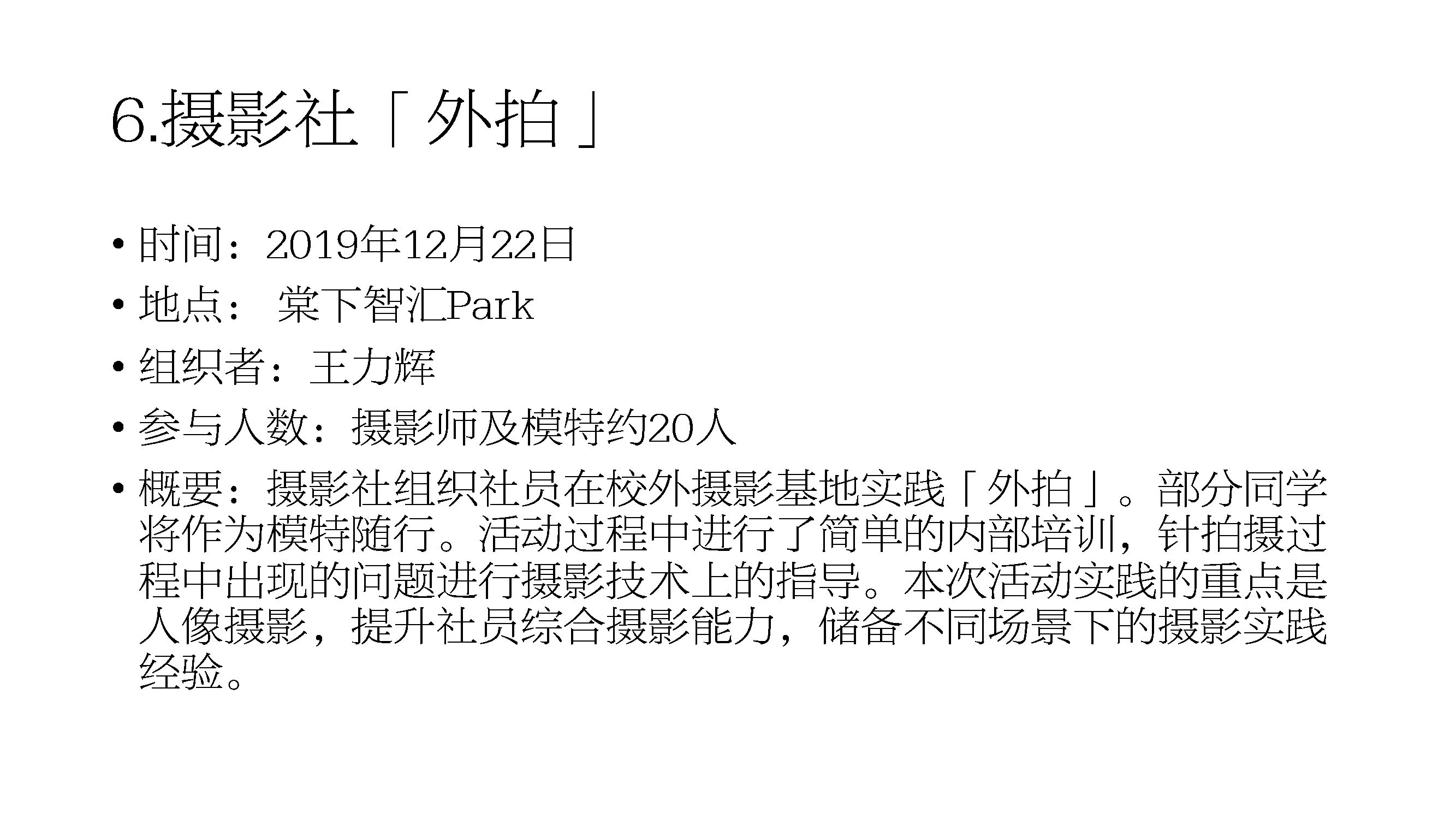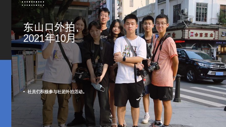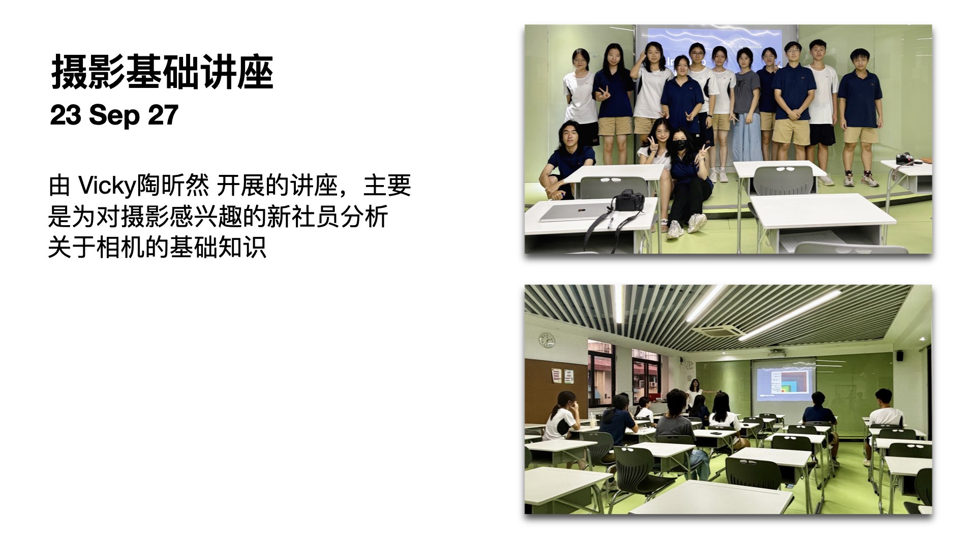 讲座旨在为新⼊社的社员建⽴对摄影这一艺术形式的基本理解和对摄影操作的初步认识。讲座从器材介绍开始,涵盖了前期摄影中必备的几大类型的知识,包括有器材介绍、参数调节和构图规则等。讲座时常一小时左右,为社员们提供了从兴趣到实操的过渡渠道。