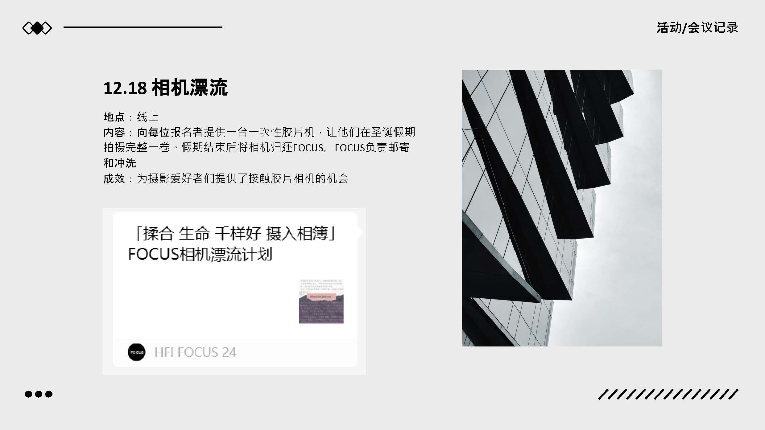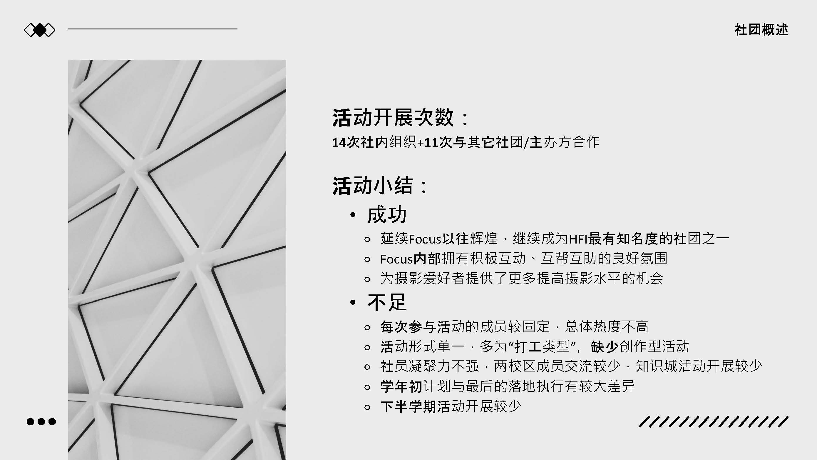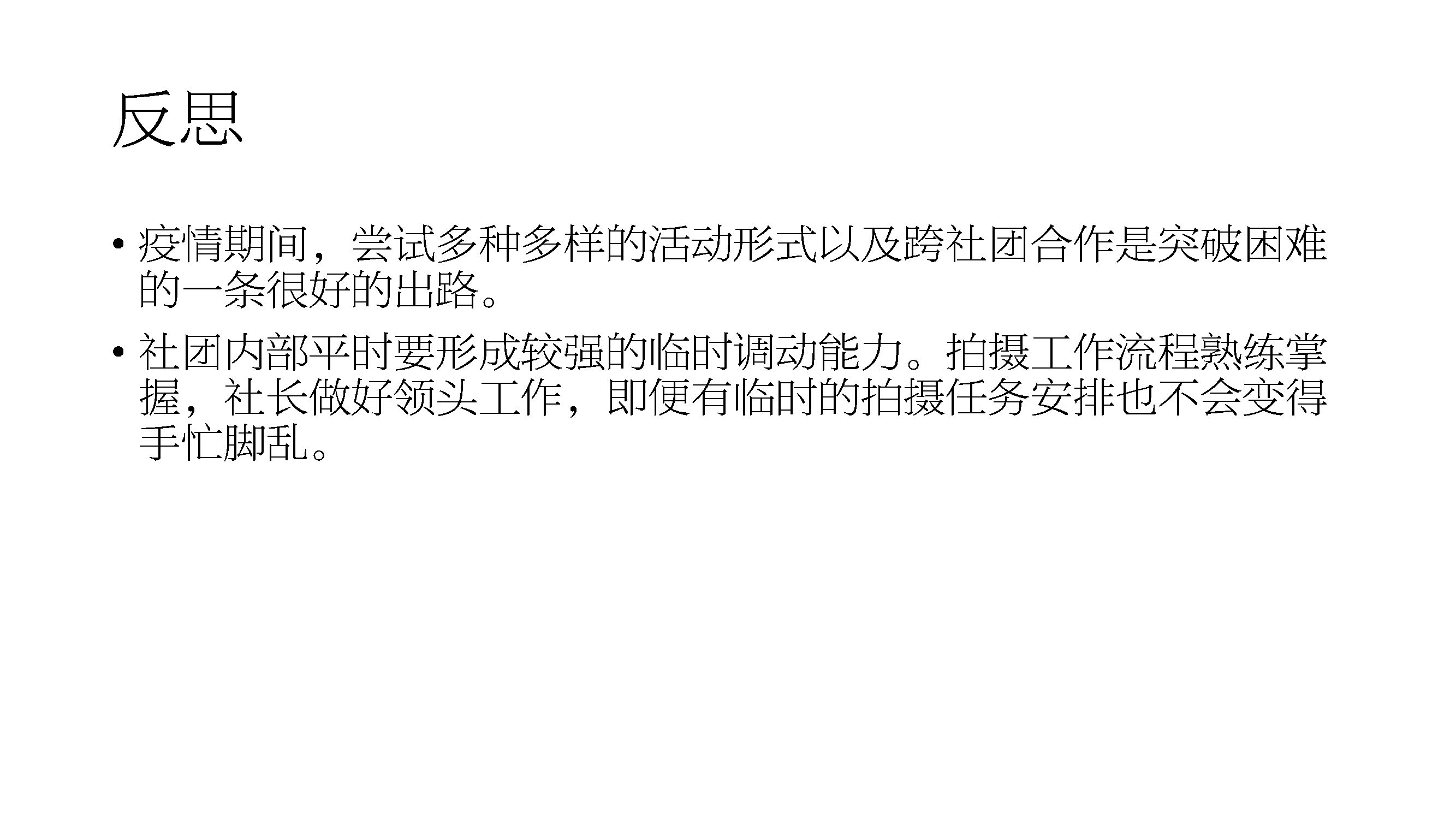讲座旨在为新⼊社的社员建⽴对摄影这一艺术形式的基本理解和对摄影操作的初步认识。讲座从器材介绍开始,涵盖了前期摄影中必备的几大类型的知识,包括有器材介绍、参数调节和构图规则等。讲座时常一小时左右,为社员们提供了从兴趣到实操的过渡渠道。