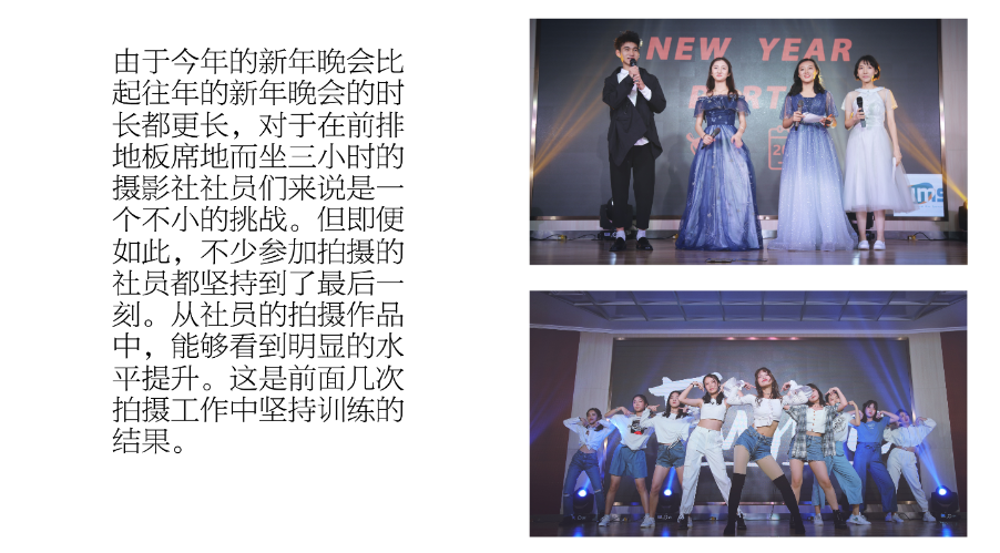 ⼀年⼀度圣诞晚会少不了摄影社社员全程跟拍的身影。一大批的社员在评委席前的空地席地⽽坐并拍出了精美的照片。