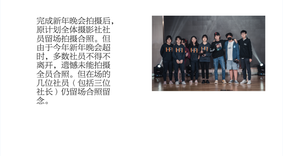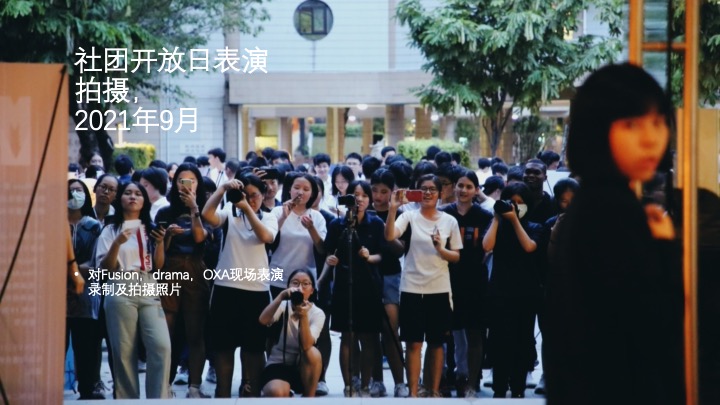 国际⽇期间,摄影社安排每个节目三到四人的拍摄,其中 Fashionist 的节目更是让大家都来观众席中央拍摄。