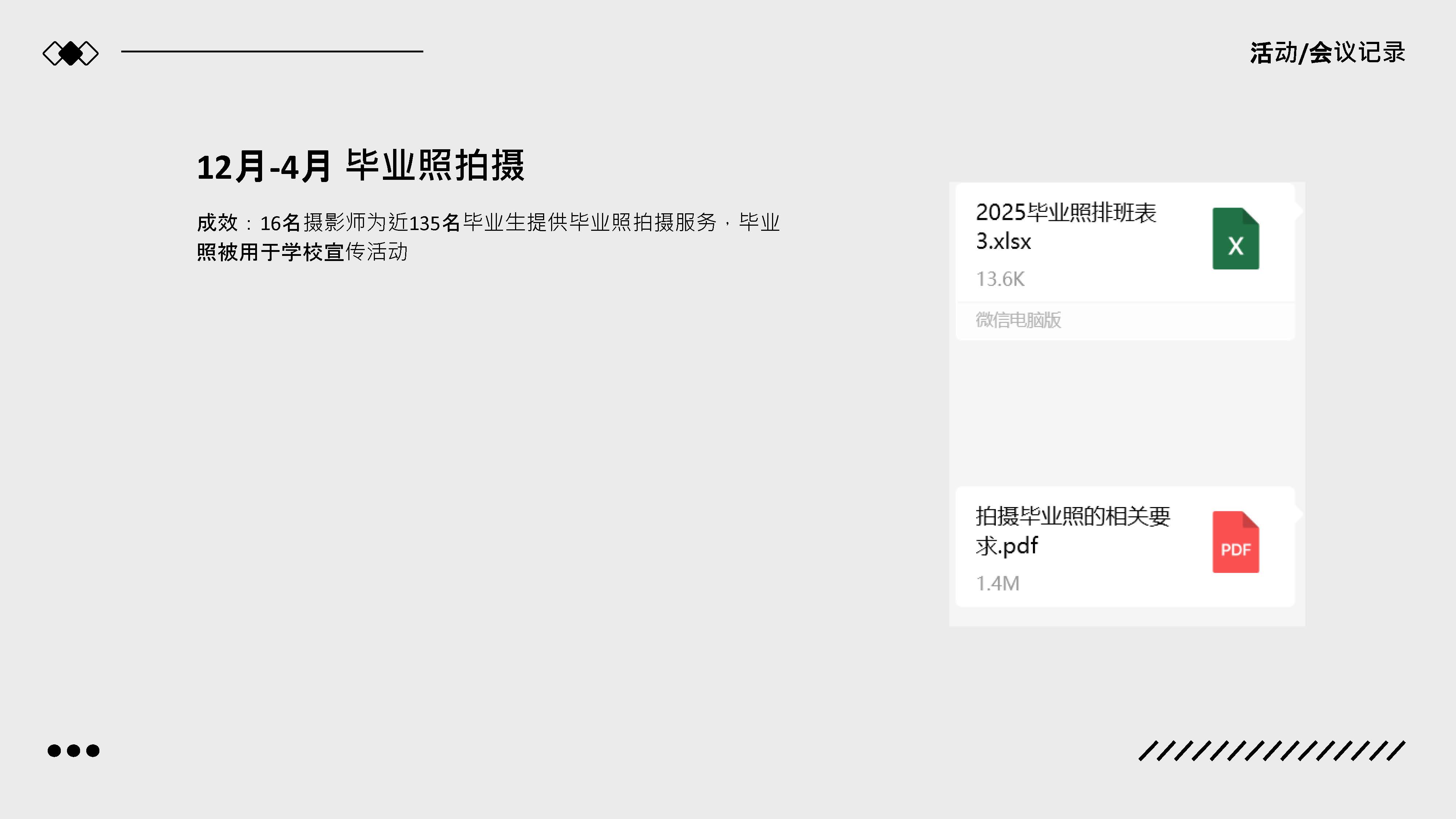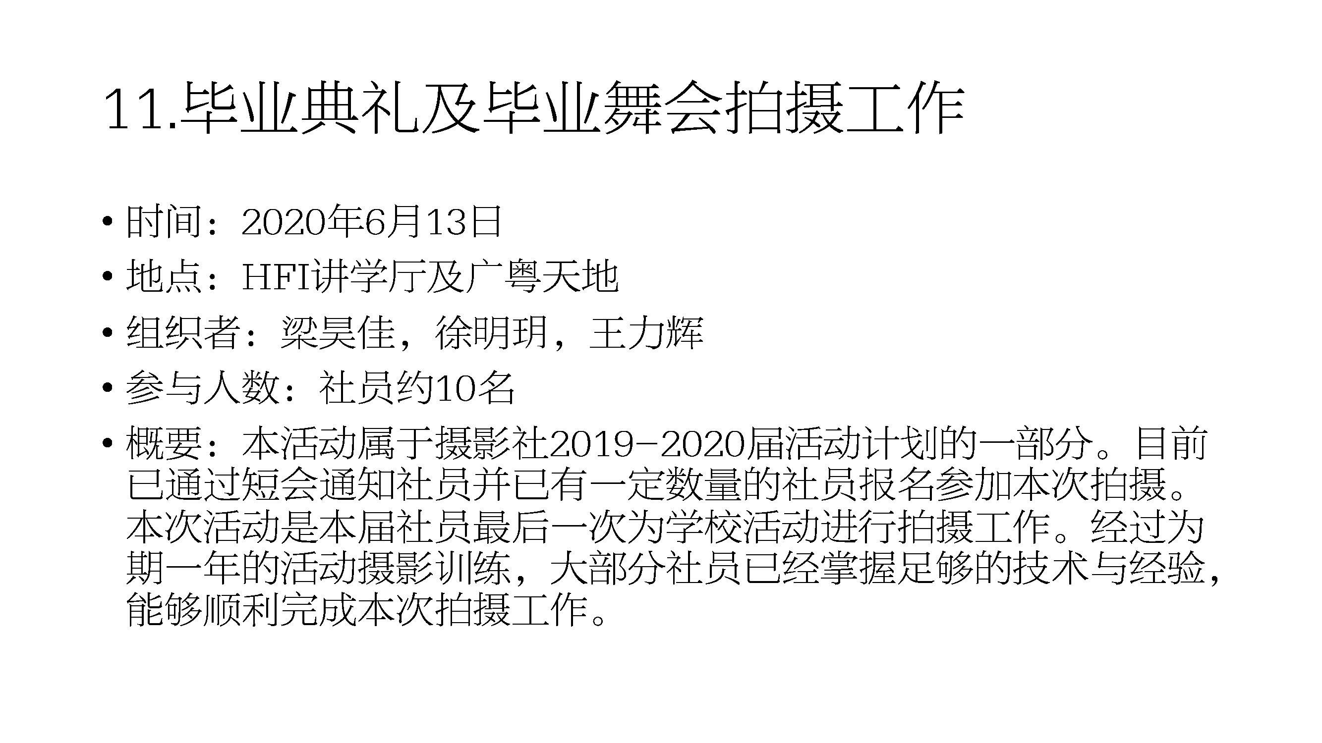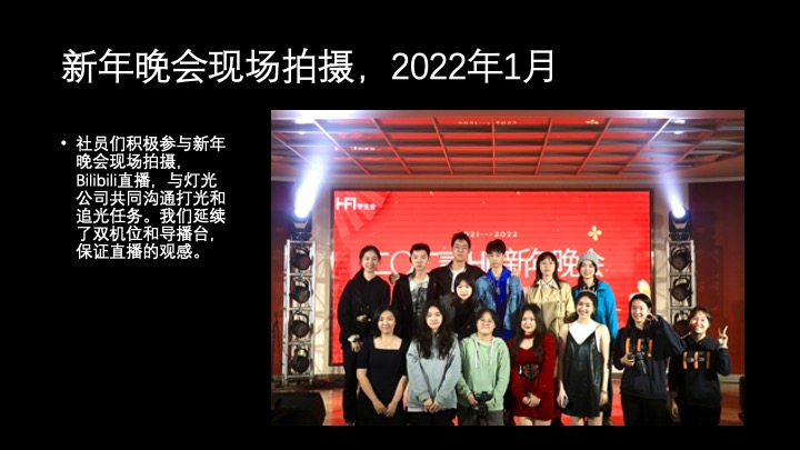 晚会直播(成功举办3届以上)、毕业照拍摄、外拍、各比赛/活动拍照返图、万圣&社开等活动录制。