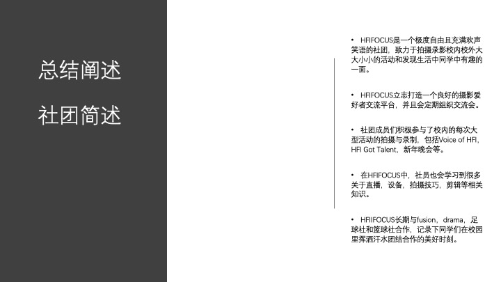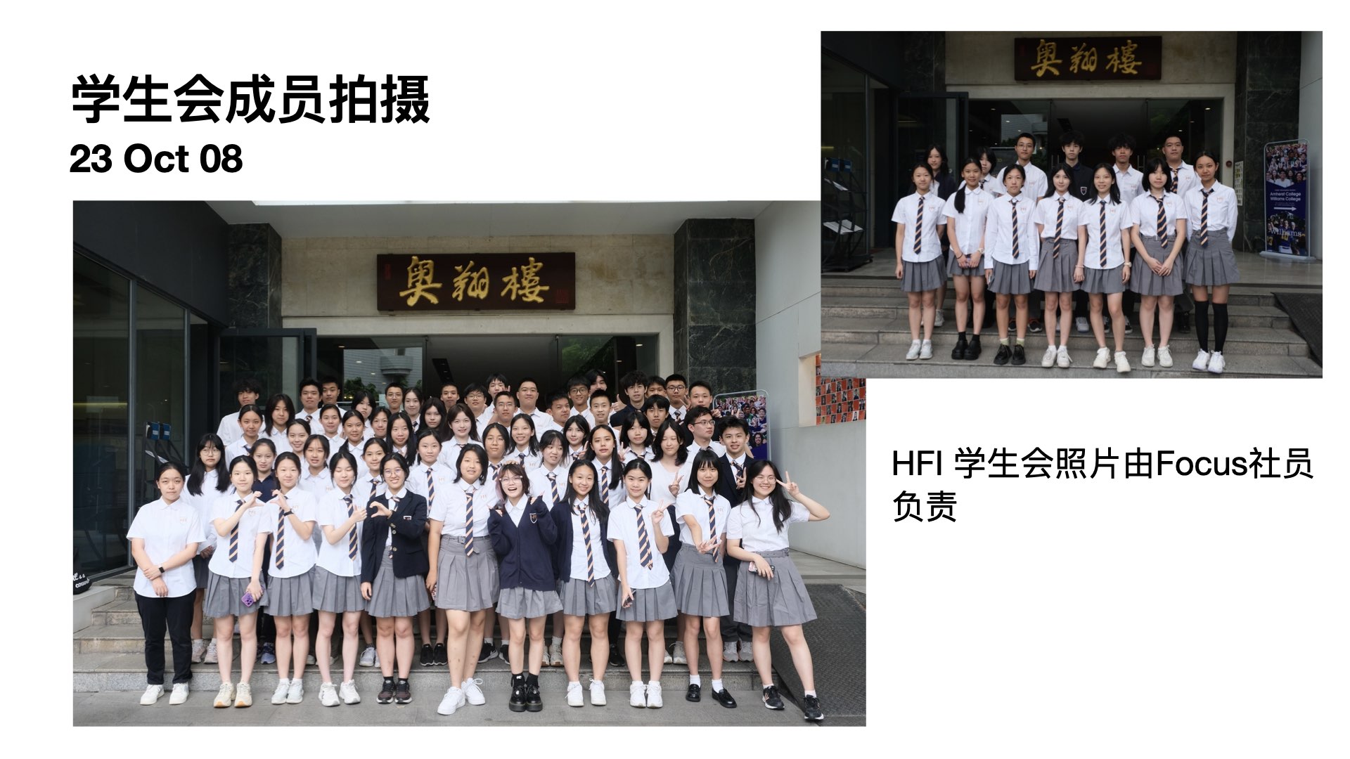 为了让同学们更具体更细节地了解HFIPhotos,HFIPhotos于8.18举行了招新说明会,具体内容包括社团工作内容(校内活动拍摄、校外外拍、广东省中学生摄影邀请赛),社团福利(定期Lecture、外拍吃喝玩耍、志愿者时数),以及加入方式进行了具体的说明。