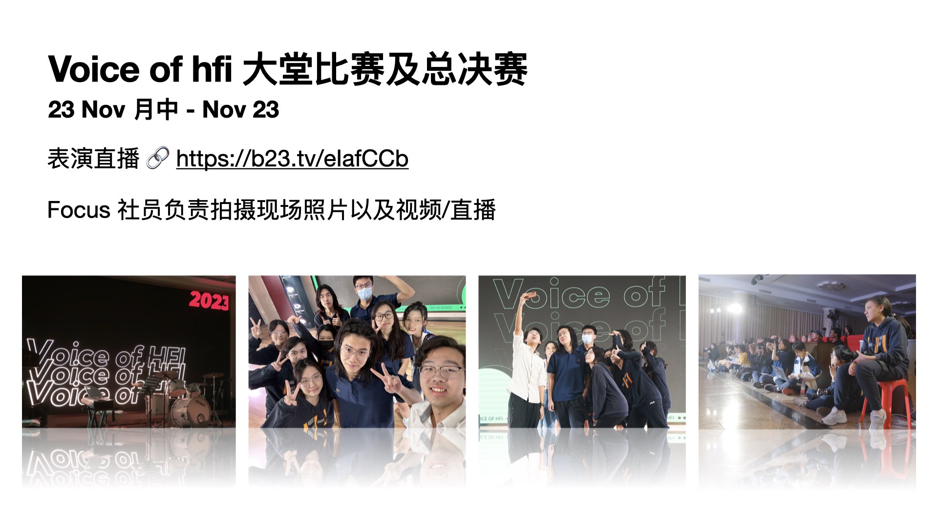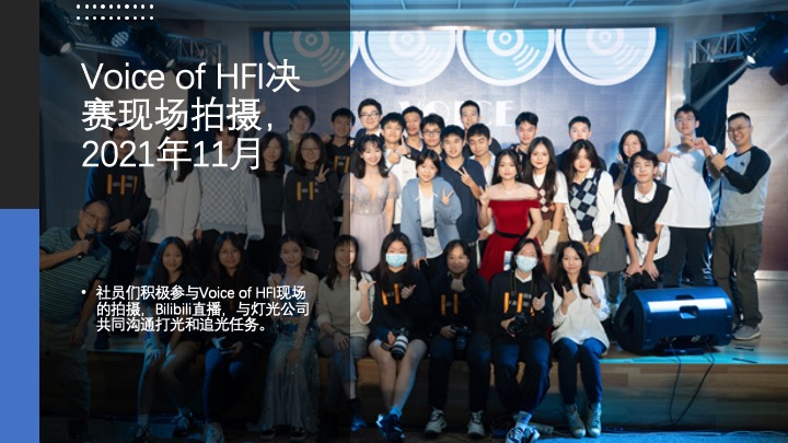 摄影社在 11 月 18 日晚为 VOICE of HFI 比赛摄影,定格了各大社团的表演的精彩瞬间。照片全部提供给CLAP社并在其公众号中呈现。