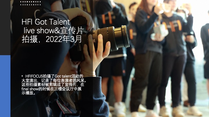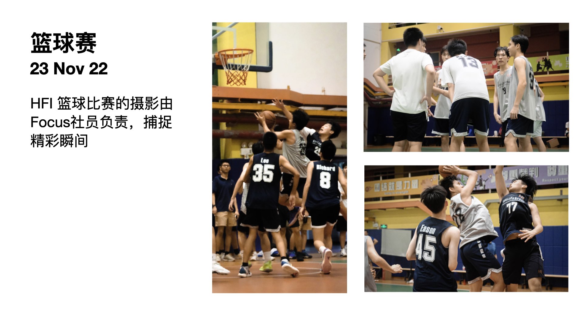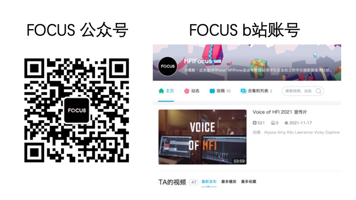 FOCUS是HFI的一个影像类社团,参与校内的每次大型活动的拍摄、直播、与录制,包括VOICE OF HFI,HFI GOT TALENT,新年晚会等。除此之外,FOCUS长期与FUSION,DRAMA,足球社和篮球社合作,记录下同学们在校园里挥洒汗水团结合作的美好时刻。我们立志打造一个良好的摄影爱好者交流平台,并且在接下来的一年会开展外拍、讲座、校内摄影展等活动。