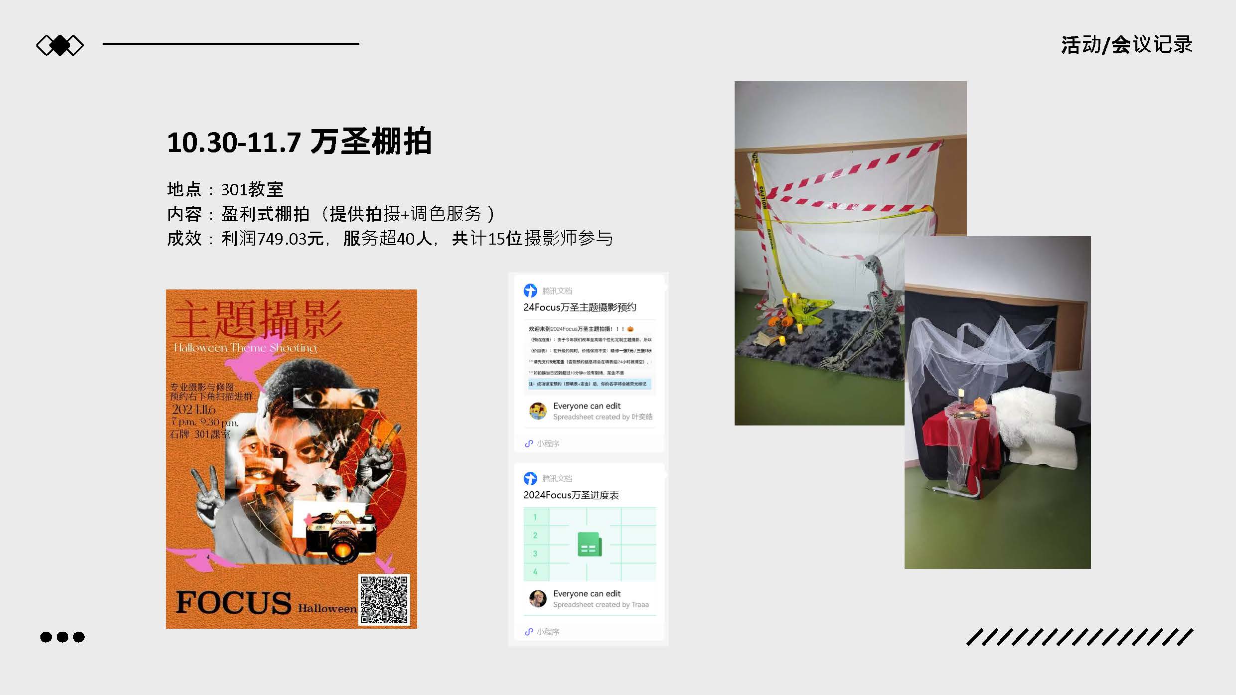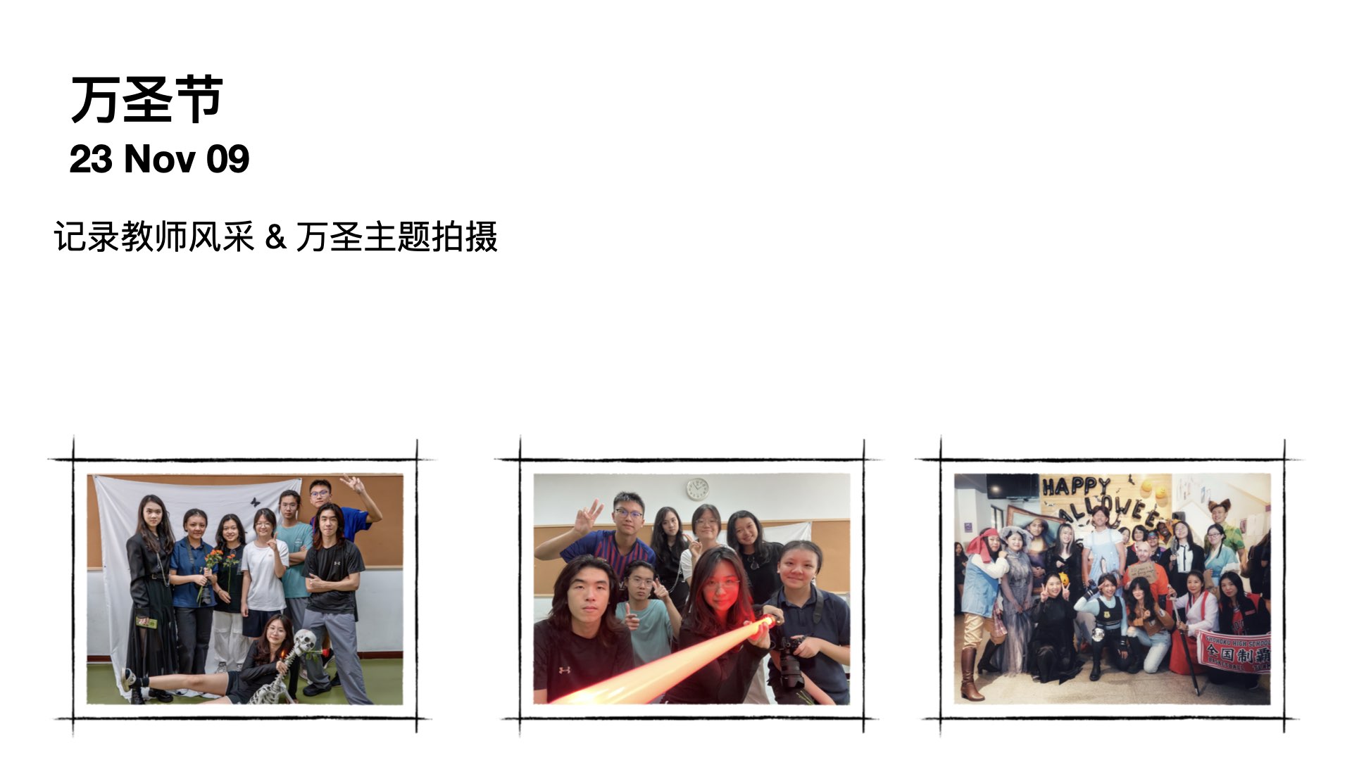 尽管今年的万圣节活动推迟了一周才举行,但这并没有影响到同学对万圣节主题摄影的热情。与以往不同的是,今年我们选择在学校租了305作为拍摄主场地,并提前买了万圣风的装饰品进行布置。活动当天中午提早开放了预约时间,并在晚上的两个小时的拍摄时间中为高达二十组同学进行多对一的艺术拍照。活动规模比我们想象的要大很多,但在拍摄后的一对一针对修图工作分配后,基本上所有同学的照片都在一周内返图。