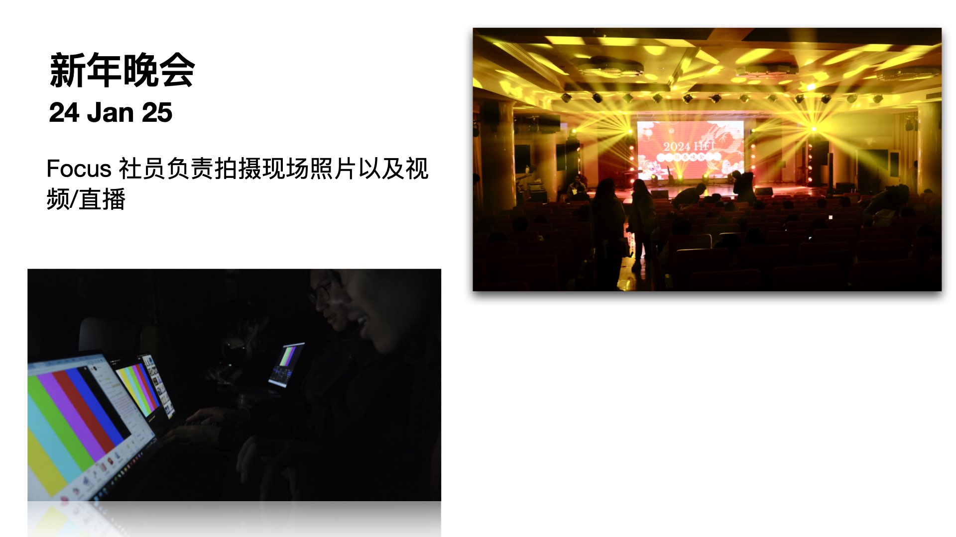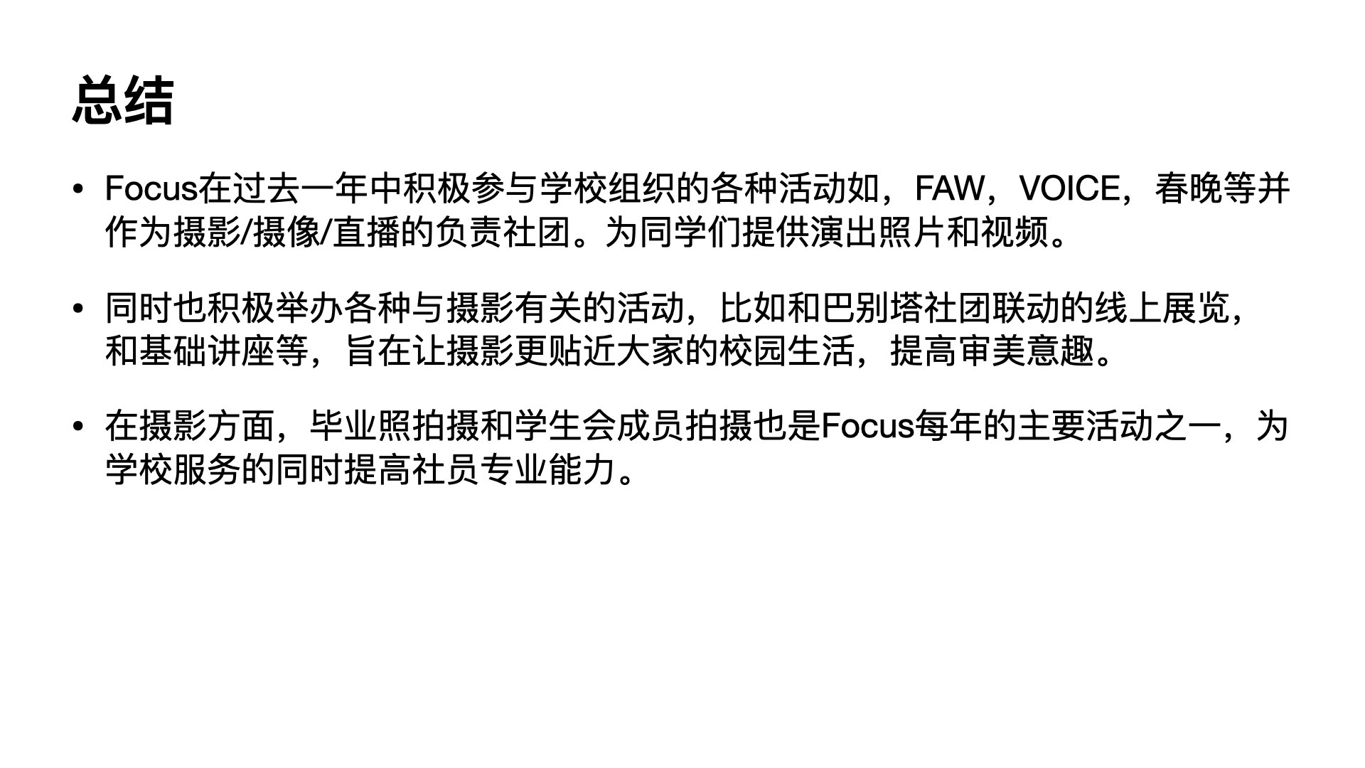 FOCUS主要分为两个部门,摄影部主要负责校内大型与小型活动/晚会的拍摄与返图、举办万圣节摄影活动、合作校刊等;技术部主要负责大型活动的视频记录、直播、剪辑、调色等拍摄与后期制作类任务。