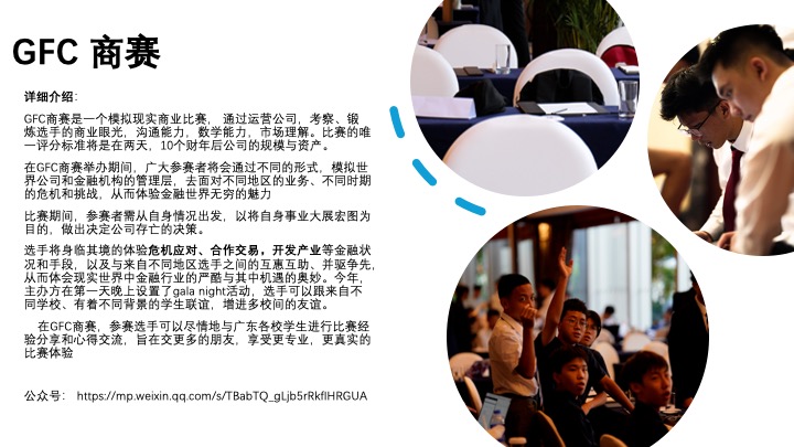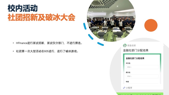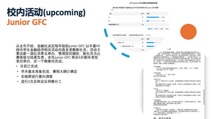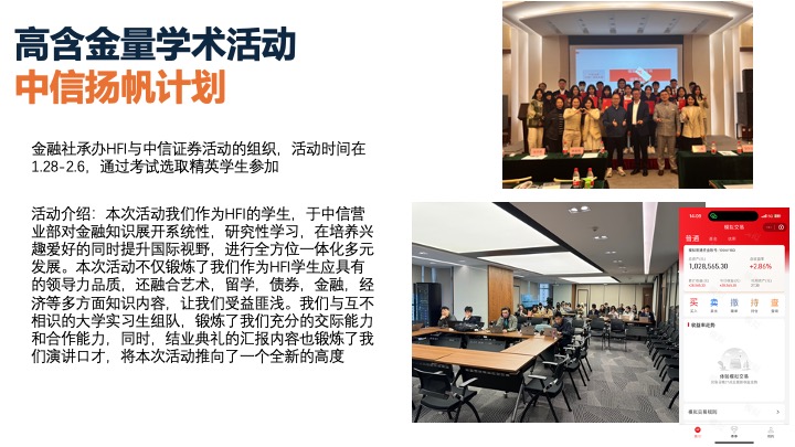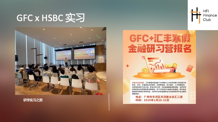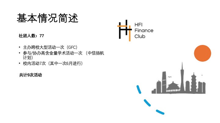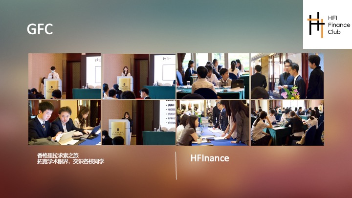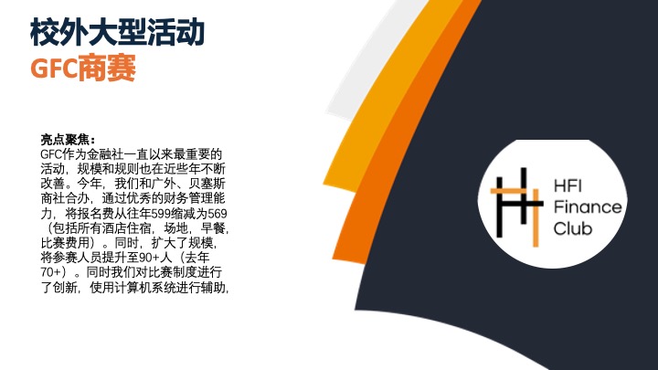 HFIANCE主办GFC商赛,今年已是第12年,为华南地区含金量最高的商赛。日常活动包括定期讲座与各类金融相关拓展活动(如JUNIOR GFC)。同时,社员也会参与社团活动组织的实操。
