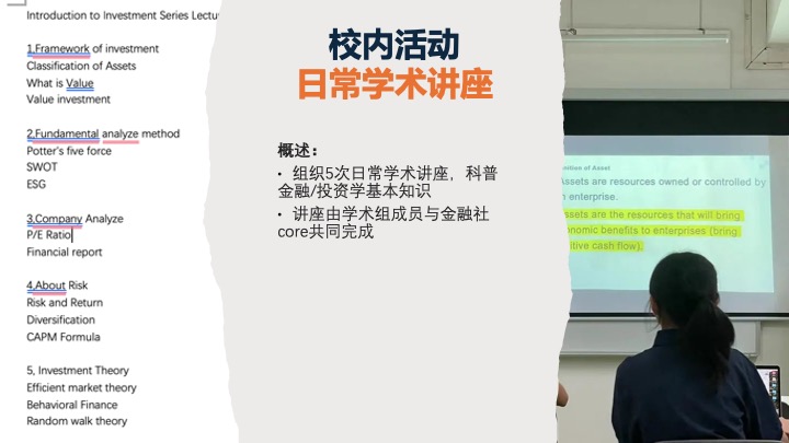 社员致力于为学校师生提供校内外的实践活动机会,帮助同学们学习金融商业知识以及建立良好的沟通能力与组织能力,也为同学们的职业规划提供辅助性建议