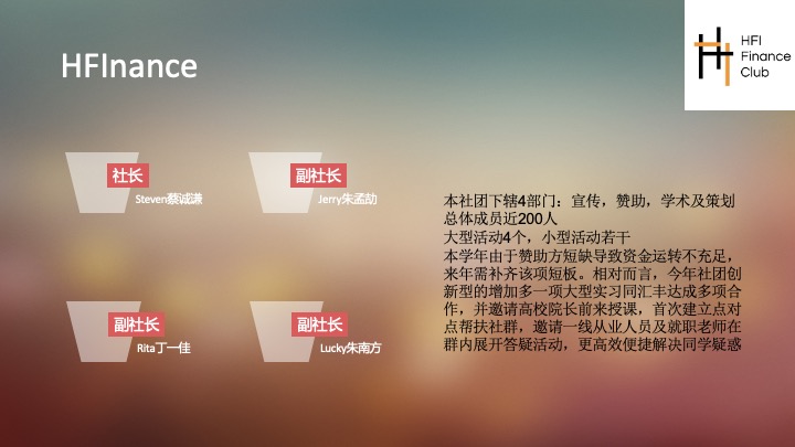 HFInance是华附国际部历史最长,规模最大的社团之一。从创社至今,HFInance已从一个学术社团发展为一个全方位的校园金融与商赛平台。