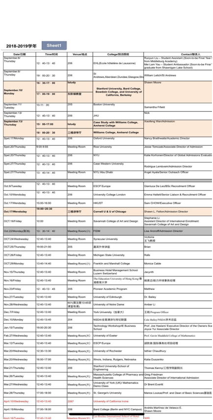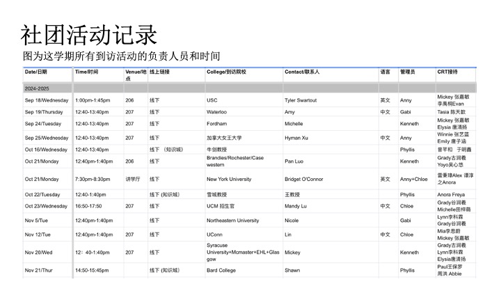 在大学来访前对目标大学进行研究,并提前在校内宣传,在大学来访时向招生官简单介绍我们学校,并指引帮助他们到达会场。在每次活动之后记录反馈,加入数据库中帮助同学未来更好了解海外大学。主动联系招生官和校友,建立其与在校学生沟通的桥梁。