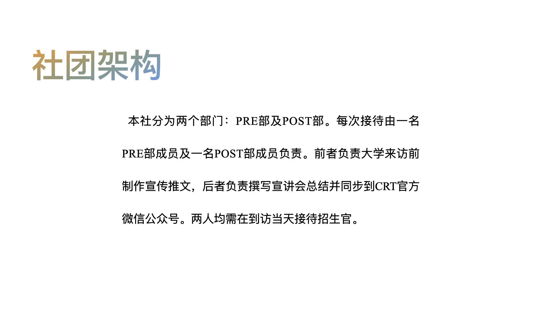 CRT (大学接待社团) 的主要工作是在大学招生官到访期间为其提供接待与翻译服务,同时展示我校学生的学术水平与精神面貌。招生官到访前,成员先对大学进行简单的了解,通过推文或微信公告的形式告知其他同学有关信息,以便感兴趣的同学参与到招生官宣讲会当中。如招生官无法线下宣讲,我社成员会在线上平台与招生官连线,做好直播间听众与招生官之间的传达与翻译工作。