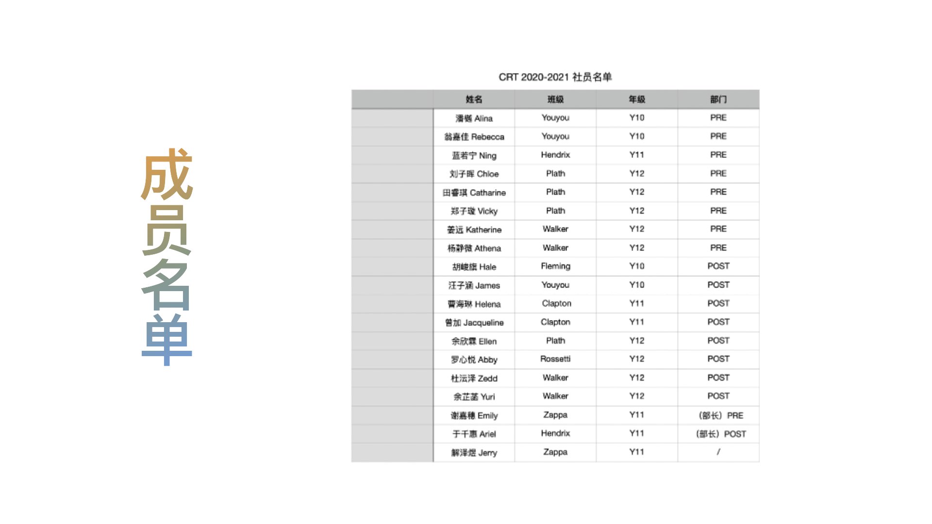 CRT的社团活动主要以宣传,接待,总结三个部分构成。今年在管理层重组后由原来四个部门精简为pre和post两个部门,每个部门配备一位部长,增加了成员的参与度并提高了效率。经过10个月的实验证明此管理方法是正确且有效的。