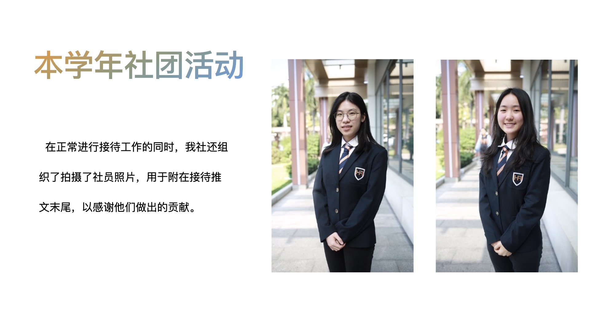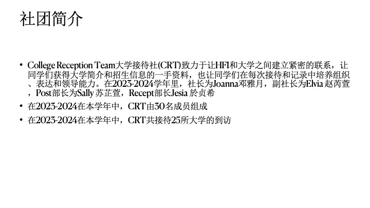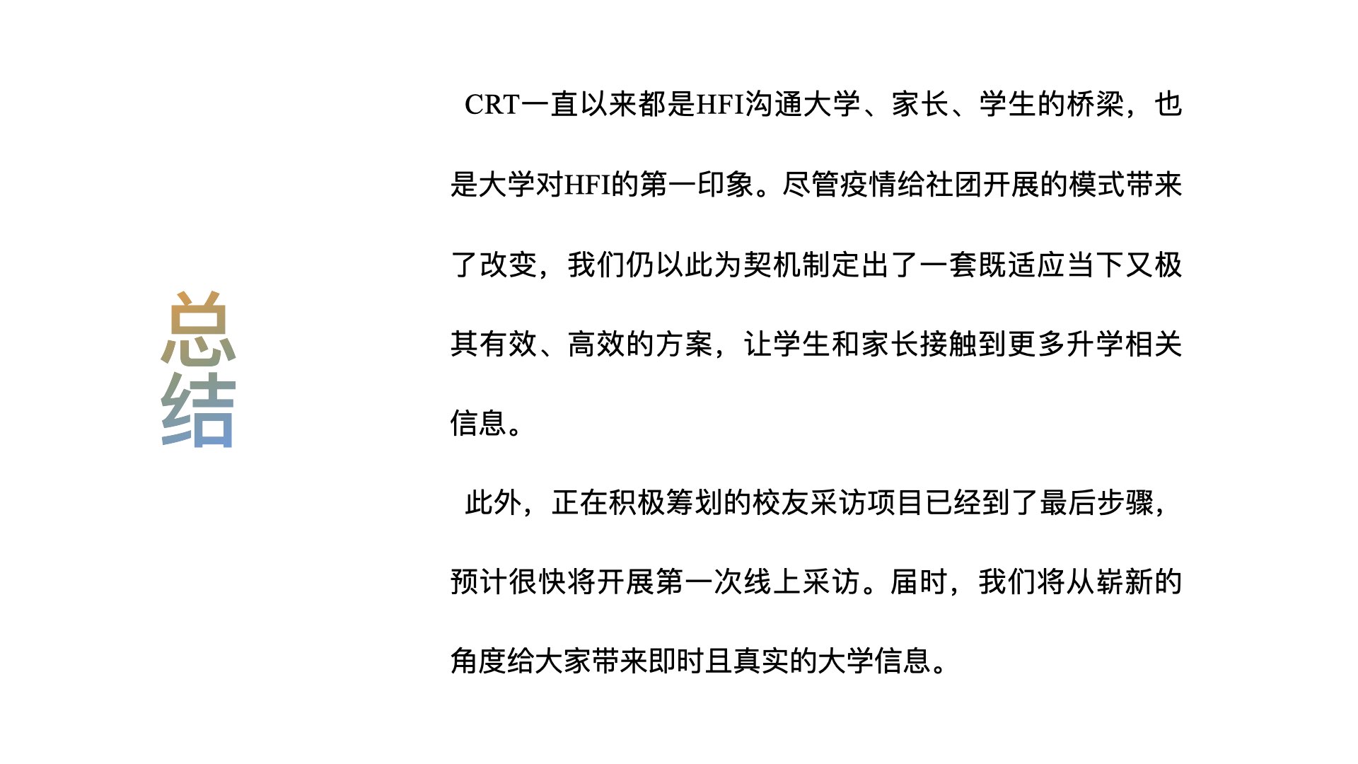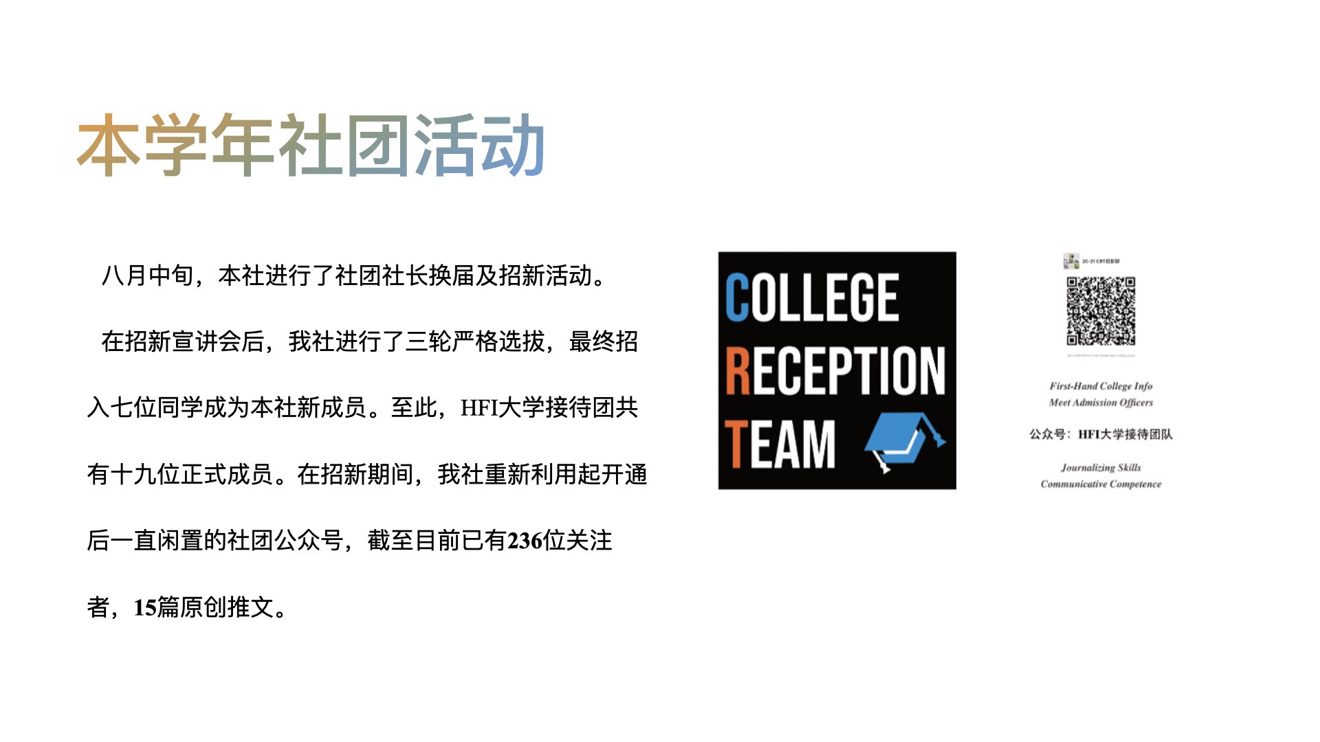 CRT (college reception team) 's main job is to provide reception and translation services to admission officers during their visits, and to demonstrate the academic and spiritual attitude of HFI students. Before the admission officer's visit, members will have a brief understanding of the university and inform other students of the relevant information through posts or Wechat announcement, so that students who are interested in the university can participate in the information session. If the admissions officer is unable to visit our campus offline, members of our club will communicate with the admissions officer on the online platform to host and translate for both the audience and the admissions officer.
