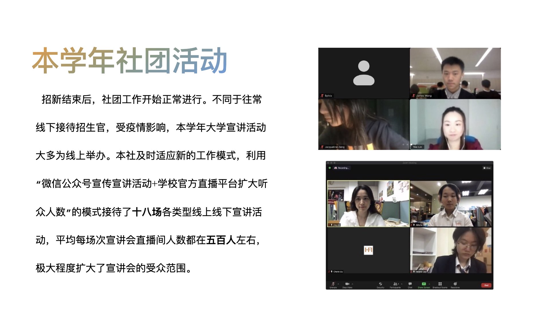2021-2022学年度,CRT社团共接待二十余次招生官到访。由于疫情原因,大部分学校招生官通过线上会议室与直播相结合的方式与大家见面,但并未降低效率。目前为止,今年已知的四所到访院校全部采用线上直播模式,后续会逐渐有更多大学招生官加入,活动将在开学后陆续展开。