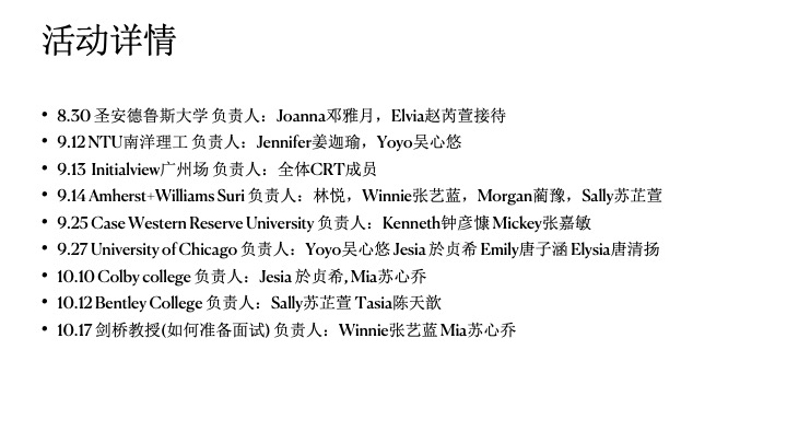 从2018年9月6日到2019年5月13日, CRT的学生代表们完成了对56所大学(或者联校)的接待,并且每一次接待都提前做好了海报宣传,公众号推送,以及引导招生官。并且在较大的来访会上(如斯坦福四校联访)担任主持以及翻译。