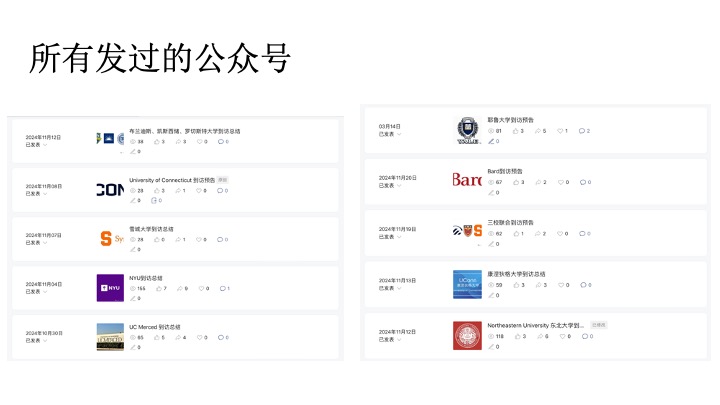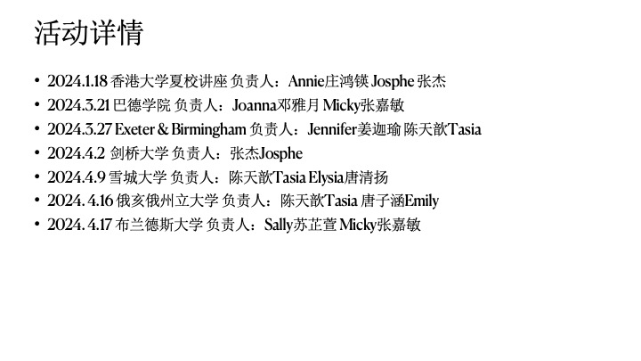 自2019年8月至11月,CRT共接待36所海外高校,覆盖英美港澳加等等地区。每一次接待均有相对应的宣传海报,推文,以及总结,通过HFI官方微信公众号或邮箱推送。由于疫情原因,2020至今无接待。