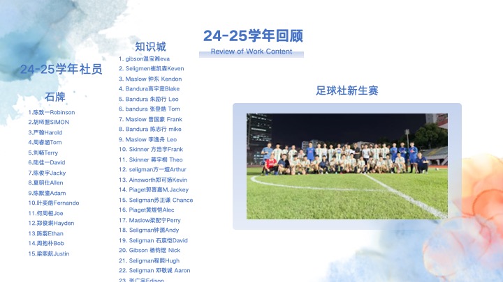 2022-2023学年社长/副社长:(男足)李锦源,钱匡奕COIN , 陈泽皓HUGH(女足)雷文迪,DAISY叶令璠 , ARYA詹舒然,YVONNE梁曦元