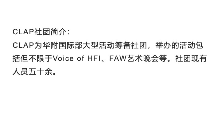 C.L.A.P社团旨在为同学们策划各类校内活动,为同学们的紧张学习生活增添色彩。在C.L.A.P历年举办的活动中, 由本社举办的Voice of HFI(华附好声音)已经成为一年一度的传统节目,也成为了华附国际部一大活动特色。本社也在重要节假日时举办一些小活动如元宵节猜灯谜等庆祝活动帮助渲染节日气氛,而此类活动多数交由高一新社员提案,策划即主导。而本届C.L.A.P争取到了与学生会联合举办圣诞晚会的机会,也交由高一新社员现场负责。我们希望能通过这个社团为所有心中有想法并且愿意尝试的同学提供施展自己抱负的平台,以此提升学生的综合学习力,规划能力和领导力,在丰富自身的同时服务于全体国际部师生。