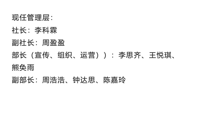 3. 社团例会(每月一次/活动筹备前一个月左右会不定次地开会)。