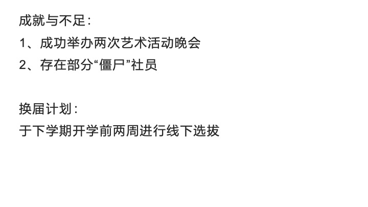 综上,10-12月C.L.A.P社效率比较高,成功举办策划两次大型活动,进行了全新的尝试,同学老师反响都不错,与学生会的合作也还算顺利,社团内部团结认真,各部门配合良好。