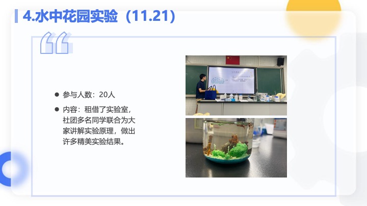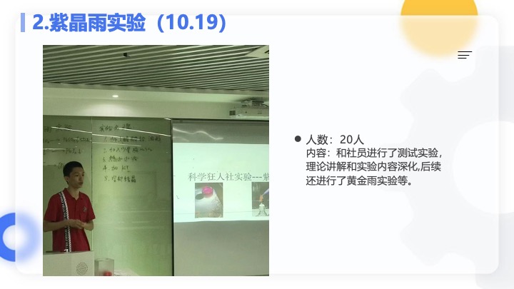 2. 科学讲座。科学讲座一般由对某一科学领域有所了解的社员讲解,主要目的为普及科学知识,让学生对科学专业有更多了解。23-24年的科学讲座目前暂定主题有:化学学科的卤素、生物学科的基因工程。