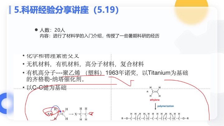 在本轮活动刚开始时,活动时间常常没有掌握好,导致内容过多、时间过长,影响了其他同学的自习。在后几次活动时,时间的掌握明显有了显著提升,能将时间控制在19:00前。参与讲座的同学人数时有变化,时则5人,时则20人,主要受到同学们忙碌程度的影响。在讲座中有竞赛例题解读和生活中化学知识的拓展,同学们的化学知识和竞赛能力都有一定程度的提高。明年可以考虑加大单次宣传的力度,增长时间与覆盖知识面,让更多的同学参与进来。