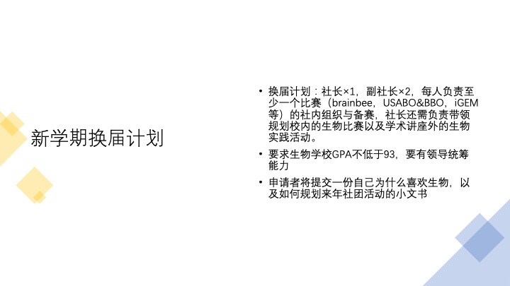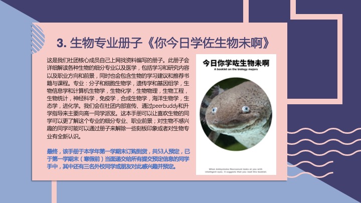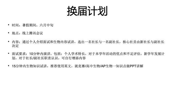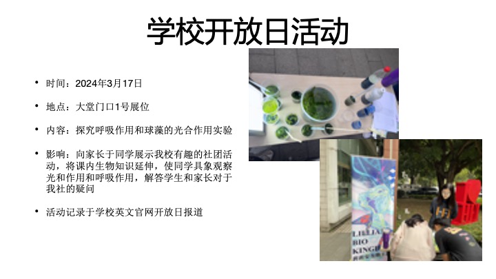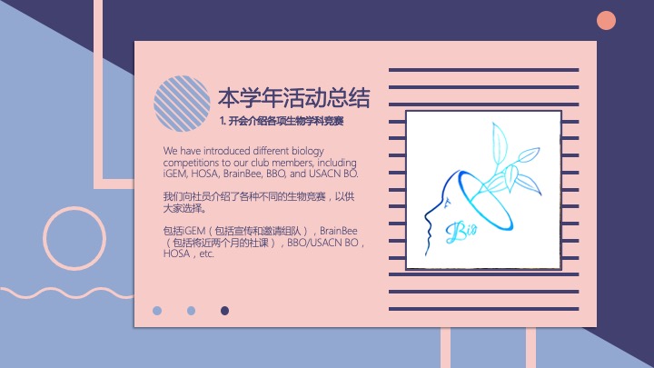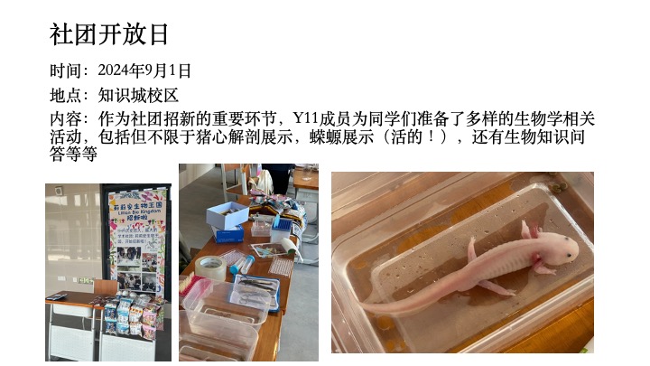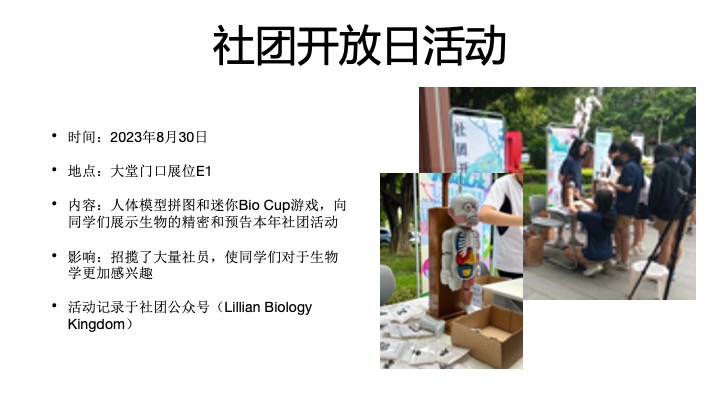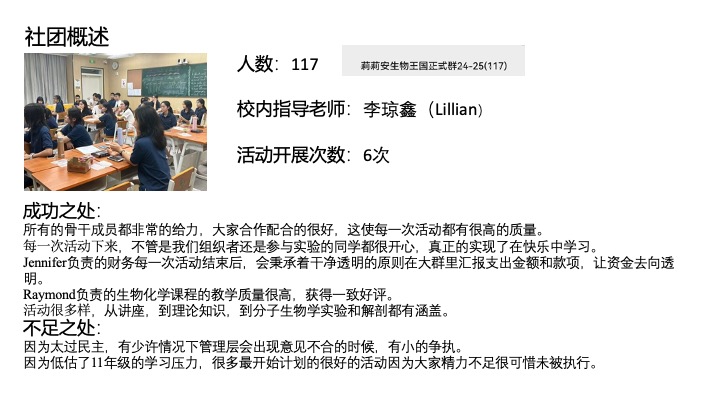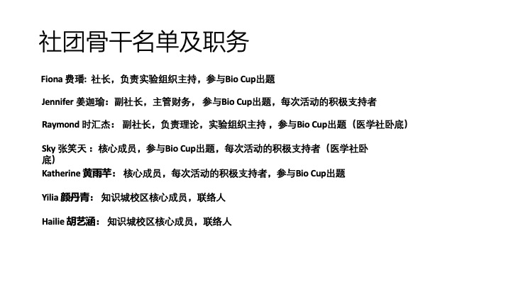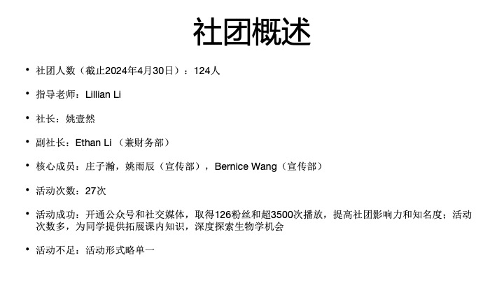 社团在未来将策划充实的学术与课外活动,并提供丰富的竞赛机会。希望同学们可以从中学习许多与生物相关的知识,并激发对于这门学科的兴趣与好奇心。