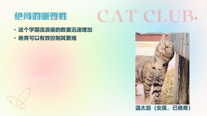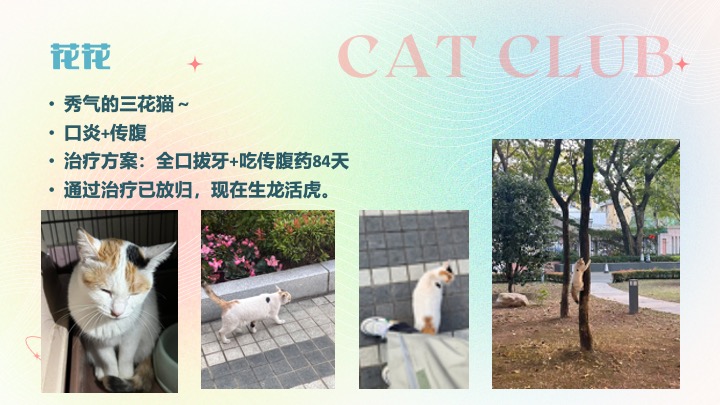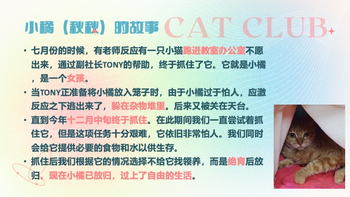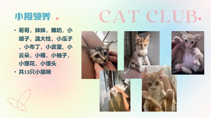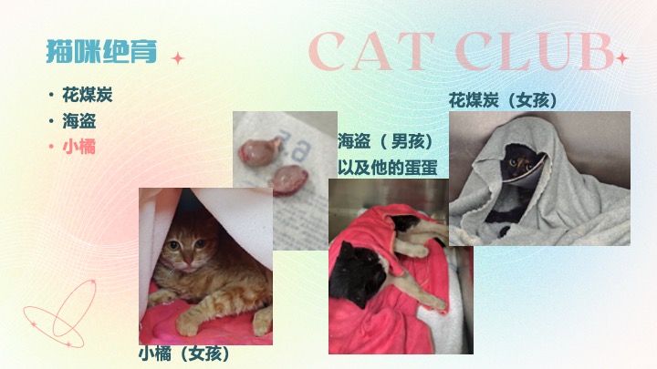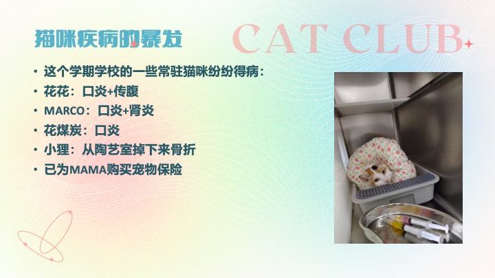 · 9月9日,举行第一次社团会议,交代喂猫守则,教新成员分辨猫咪并开始干活。当天发现小猫患上猫藓并买药进行治疗。