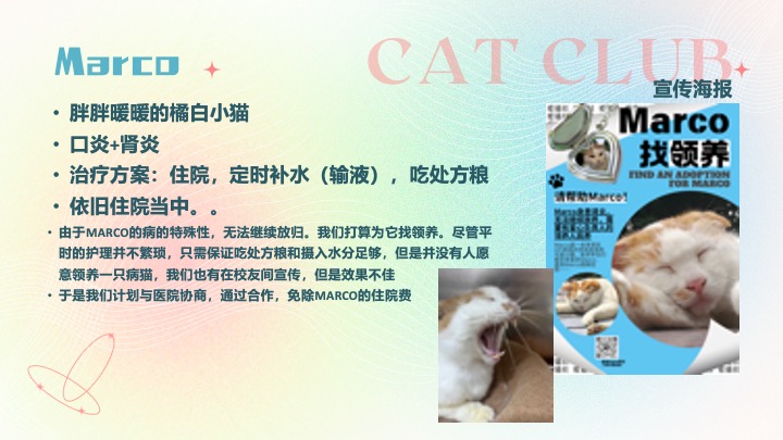 · 日常活动:早中晚喂食校内常驻的大猫(6只:小虎、灰崽、弟弟、小黑、Marco、Mama)