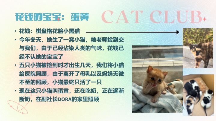 · 后续照顾小猫,同学轮流起夜给小猫喂奶,在小猫被收养前保证了小猫的健康。(参与人员:汪渝轩、连璧莹、黄诗琰、刘俞辰、张颖琦、管栎茜、叶菀萦等)