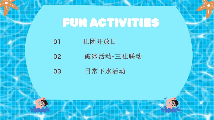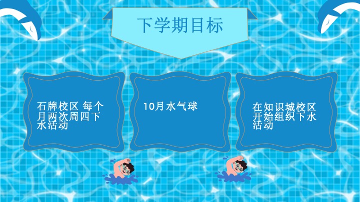 1. 每月1-2次组织集体下水自由活动及1次集体活动包括不限于技术指导,与同龄专业运动员或者教练见面交流,及
