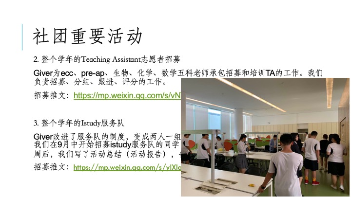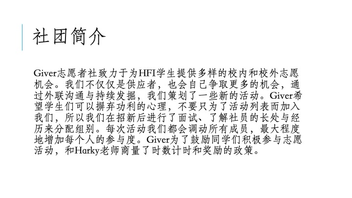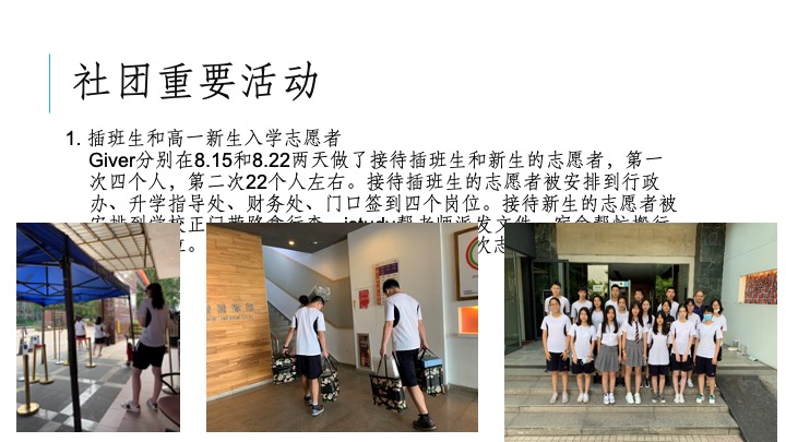 GIVER是一个愿意为学校以及社会贡献出自己的一份力的学生参加校内外的志愿活动,比如运动会、家长会等。我们不仅仅关注校内建设,还会积极联系校外的志愿组织,不断挖掘志愿机会。我们还会进行策划、外联、宣传等工作。在这里,你可以提升领导力,创新意识,学会调动身边的资源,锻炼social skills,认识志同道合的朋友,扩大交际圈。
