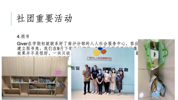4. 事件:社员们整理、分类好在之前募捐到hfi师生的约400本书本,于圣诞假期小学孩子们还没放假时运送书本过去,并与他们开展了一些互动小游戏。
