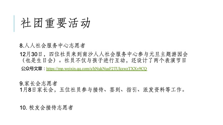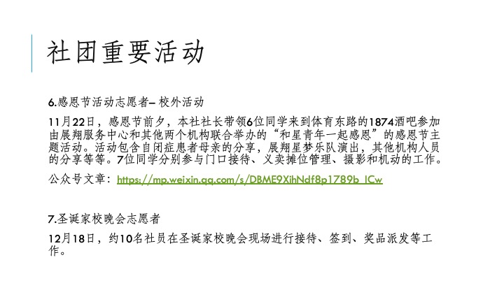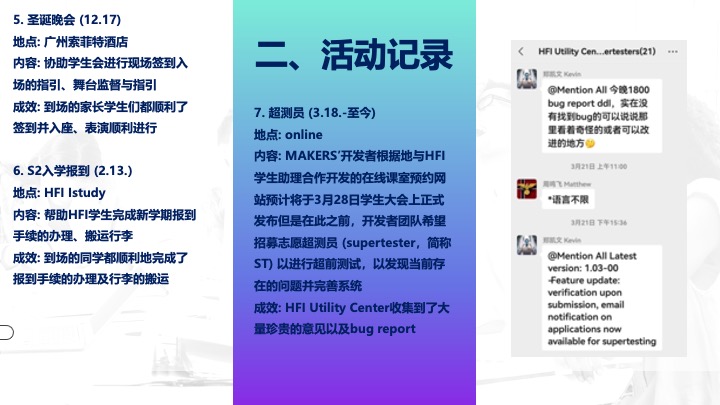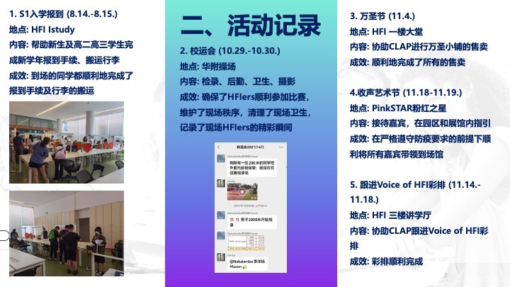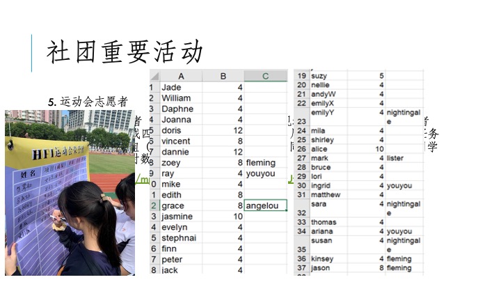 4. 事件:为了给hfi运动健儿们最好的比赛应援和支持,志愿者社分后勤、卫生、检录三个部门两天4个时段招募了16名志愿者,并提前一周为志愿者们培训。志愿者社同时设计了成绩展示板,增加士气。
