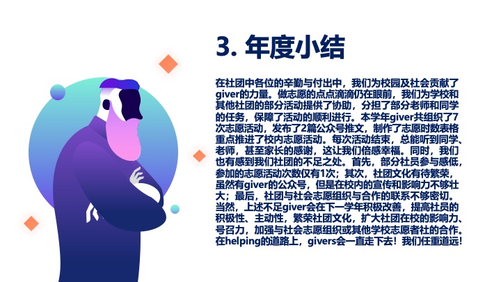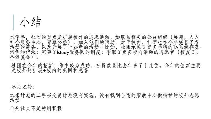 不足小结:(1)需要志愿者的活动可以建立起更有吸引力的奖赏制度,吸引更多学生当活动的志愿者。