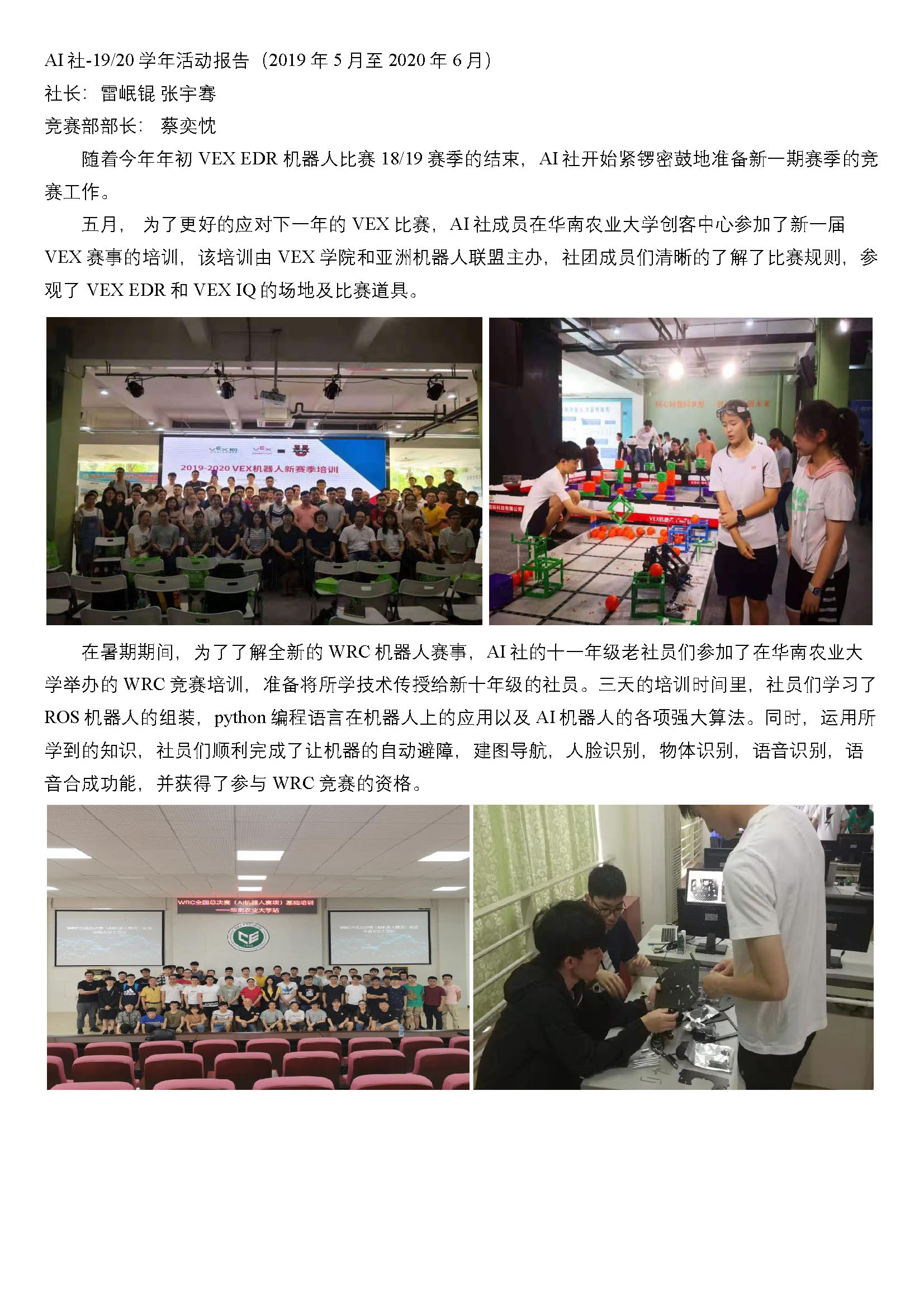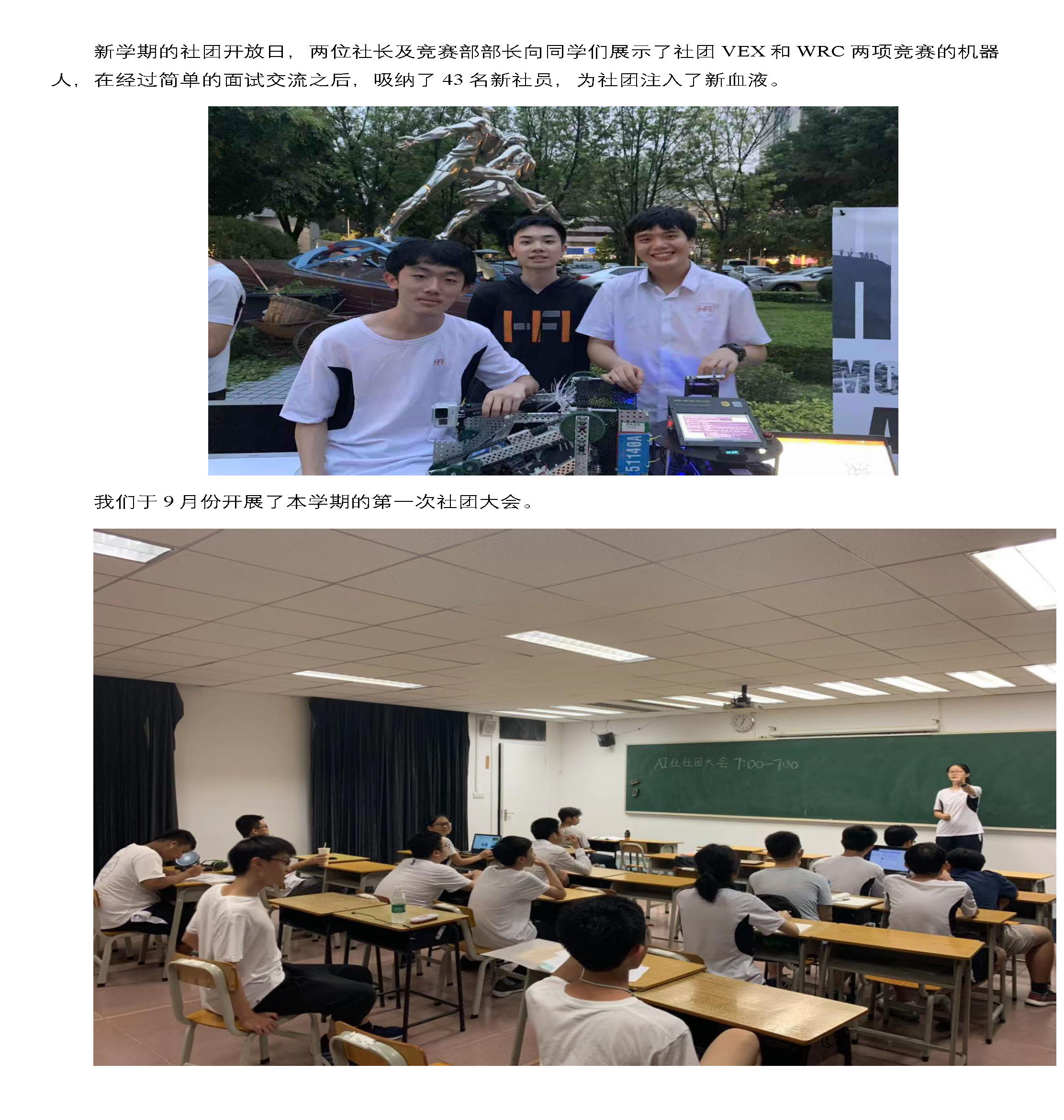 总结:上学年我社活动主要集中在VEX机器人比赛项目上,同时也积极为社区做贡献,为同学们收集总结了学习经验,制作了学习手册。今年我社将会在机器人比赛的基础上开展一系列人工智能研究项目或讲座,多方向发展社团活动,扩大活动规模,为更多的同学提供人工智能领域学习和交流的平台。
