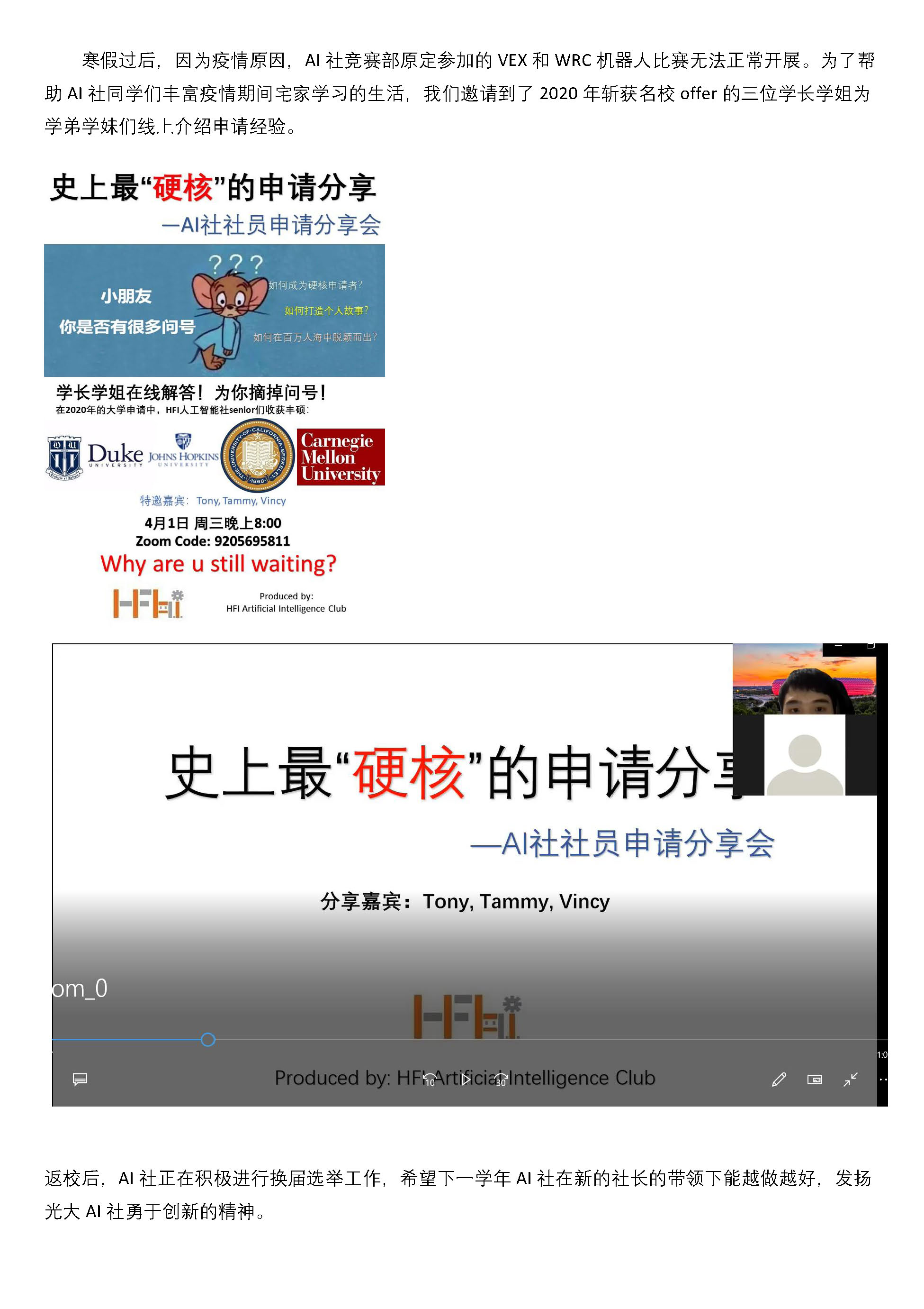 会议中交流AI领域的最新资讯;高三部分社员向其他社员介绍参加AI社团活动对大学申请的影响,以及其它相关经验分享。