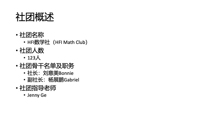 数学社团旨在为同学们提供数学不同层次的学习,为同学们的数学学习提供帮助。在历年举办的活动中, 数学社会开展大量的讲座,包括课内知识的巩固,AMC的竞赛准备,和一些有趣的高等数学。同时,从去年起我们会开展每学年一次的HFI数学竞赛。我们希望能通过这个社团为所有心中热爱数学的同学提供一个学习交流的平台,以此提升学生的综合学习力。数