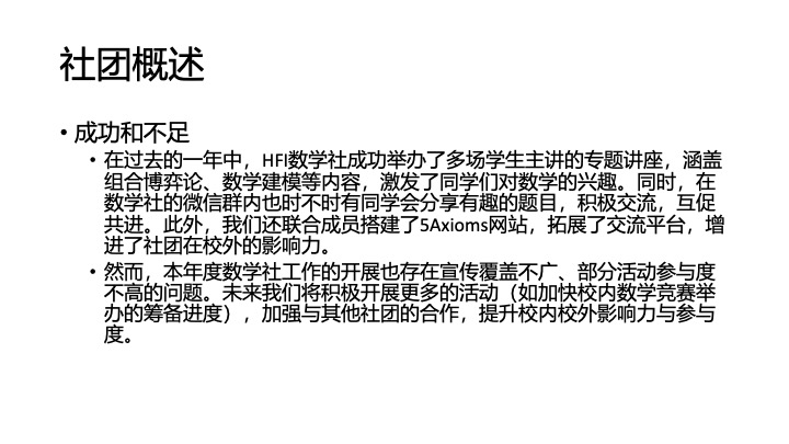 由于许多社员在初中都有数学竞赛的经历,大家在有关竞赛的讨论中显得比较积极,经常能提出一道题目不同的思路和解法。但是这种讨论的氛围有时会相对压抑(因为是学术),导致一些对数学有一定兴趣,但是能力不足的同学感到不适。如何让所有社员参与讨论,从讨论中受益是明年数学社的一个关键问题;如果能得到更有引导学生经验的老师的帮助,效果可能会更佳。数学社存在的另一个意义是给HFI这个偏文科的学校的理科生一个聚在一起brainstorm的机会,提供给想搞竞赛的同学一个训练的机会。在繁重的GPA与裱花中,我们希望能让喜欢数学的同学聚在一起讨论问题,换换思维,并且在讲课的过程中小老师也会有一定训练到自己的能力(尤其是讲课能力)。所以,我们也决定开展除了竞赛之外给出门槛更低的活动(即下文提到的公开讲座),争取让每一个没有很扎实的数学基础的但是热爱数学的同学积极参与,找到其中的乐趣.