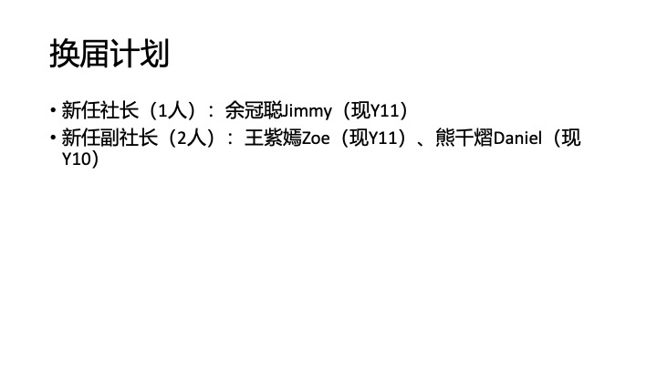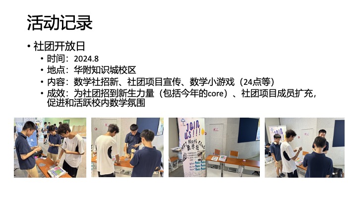 对于新一届社团核心成员的招募,我们采取公平竞争的方式。为了数学社未来的活动能够开展得更有序,我们要求新一届社长能够对数学社新一年活动的具体计划。