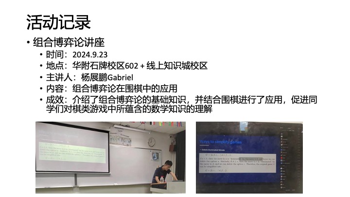 数学社组织的公开讲座向给全HFI的同学开放。今年除了由校外合作老师在线上带来的数学建模讲座,和来访学校的Exeter大学教授的数据分析讲座之外,我们社员还举办两次以丘成桐奖课题的公开讲座,均属于学术分享性质。