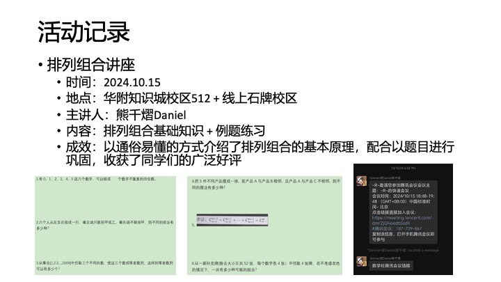 1) 在与深圳数学社团的初期交流中,我们了解到对方也因同因为学校办学规模有限导致数学社的规模较小。于是我们进行了大量的资源交换以求互帮互助地在文科学校生存下去,包括讲座自编讲义及竞赛信息的共享。