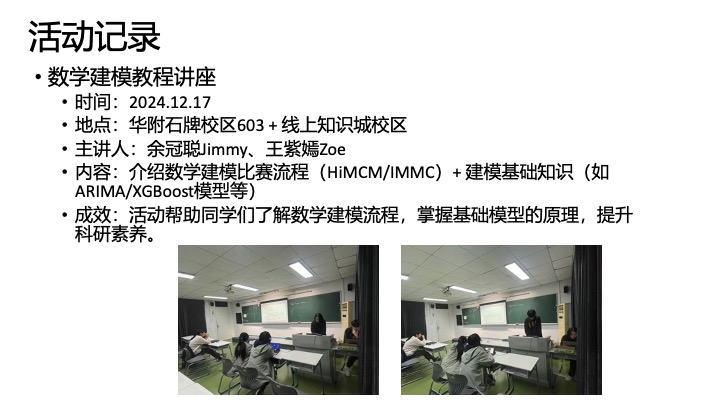 内容:邀请校外老师介绍11月的himcm建模比赛,介绍比赛报名、内容等基本信息以及如何进行准备。